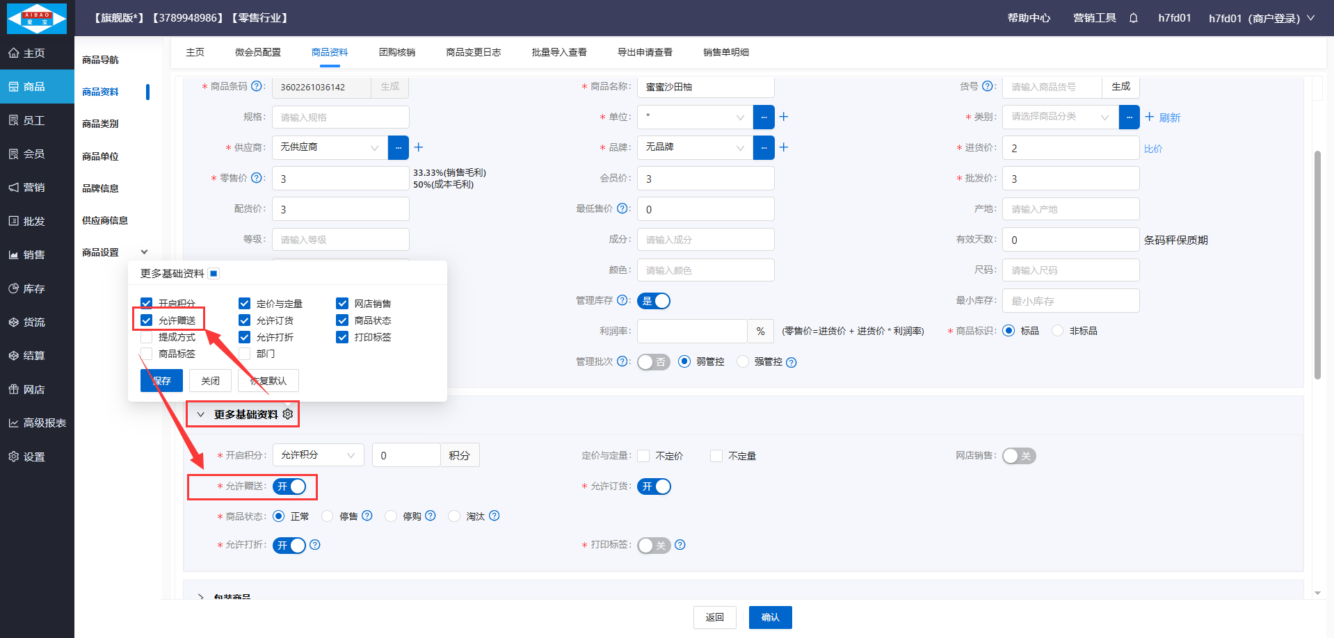 进入云后台-商品资料菜单,对单个商品编辑打开允许赠送开关。