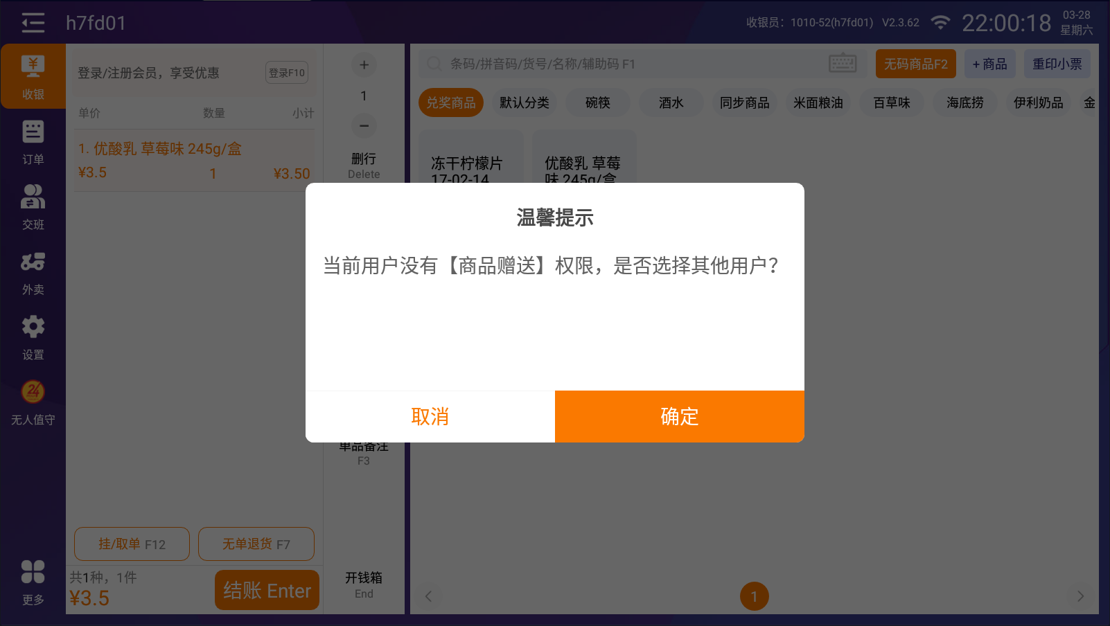 无商品赠送权限员工需要授权(授权员工需要有权限)。弹出提示框点击确定按钮,进入用户授权页面,输入有权限的员工账号密码即可。