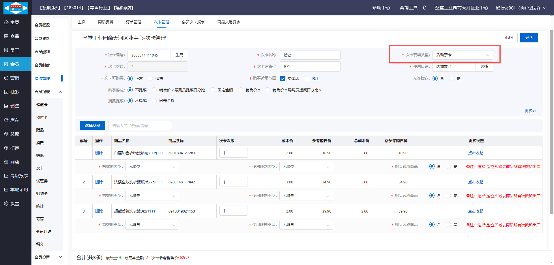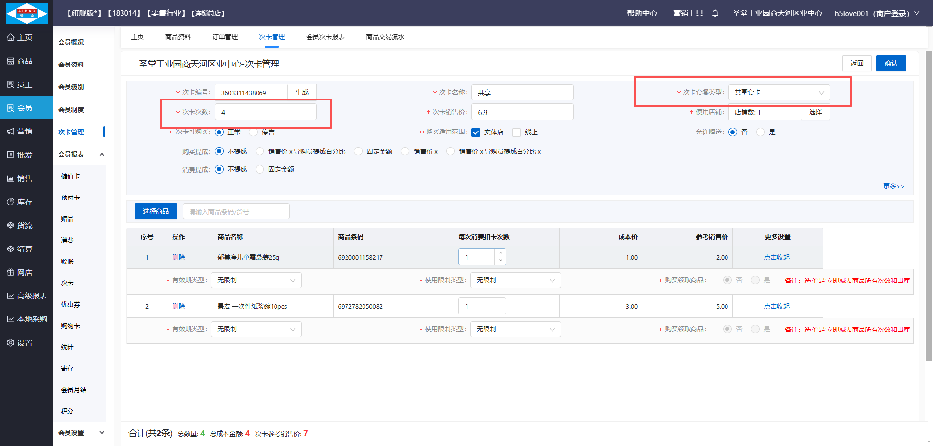 •次卡次数是核销商品次卡次数之和