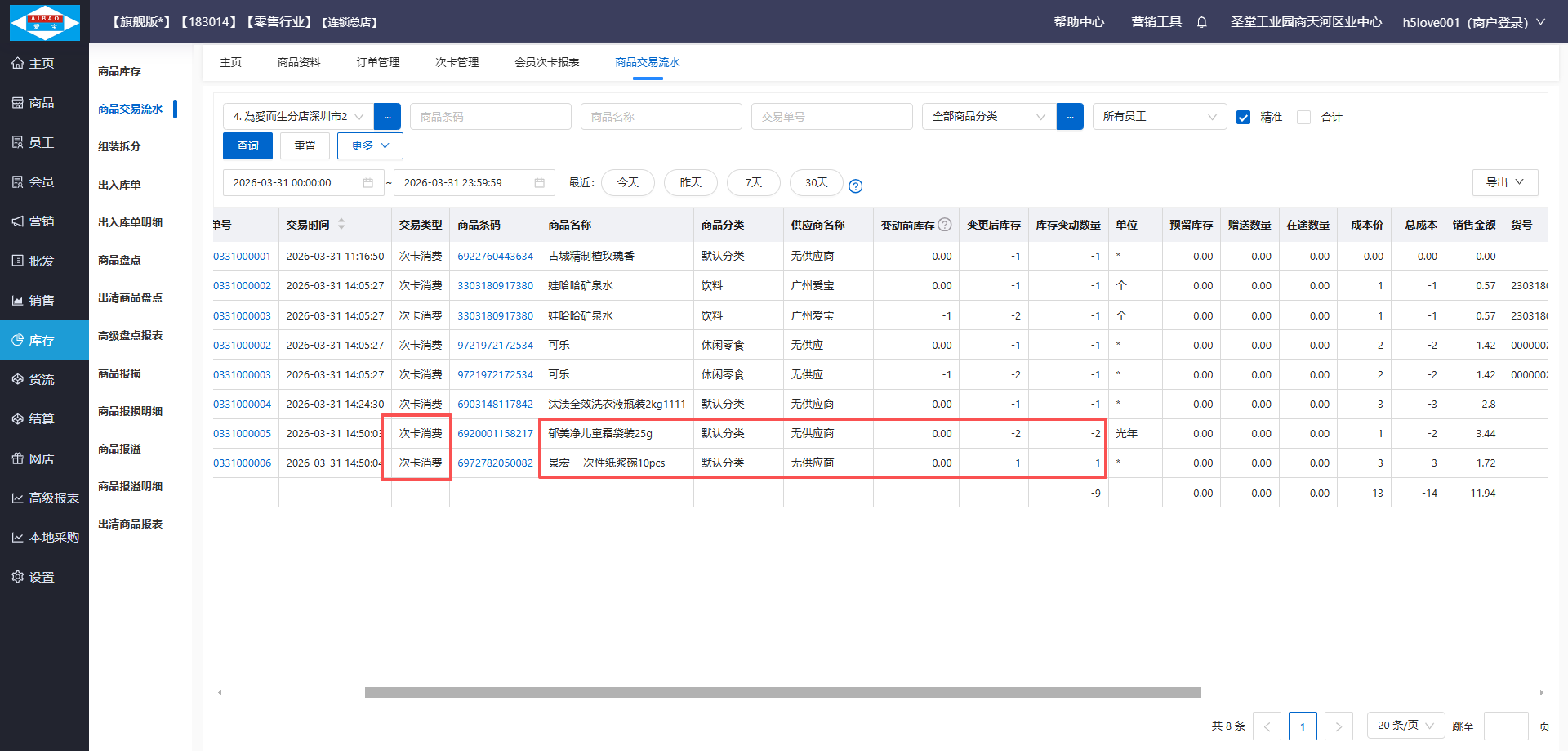 •消费商品条码:次卡消费的商品对应的条码