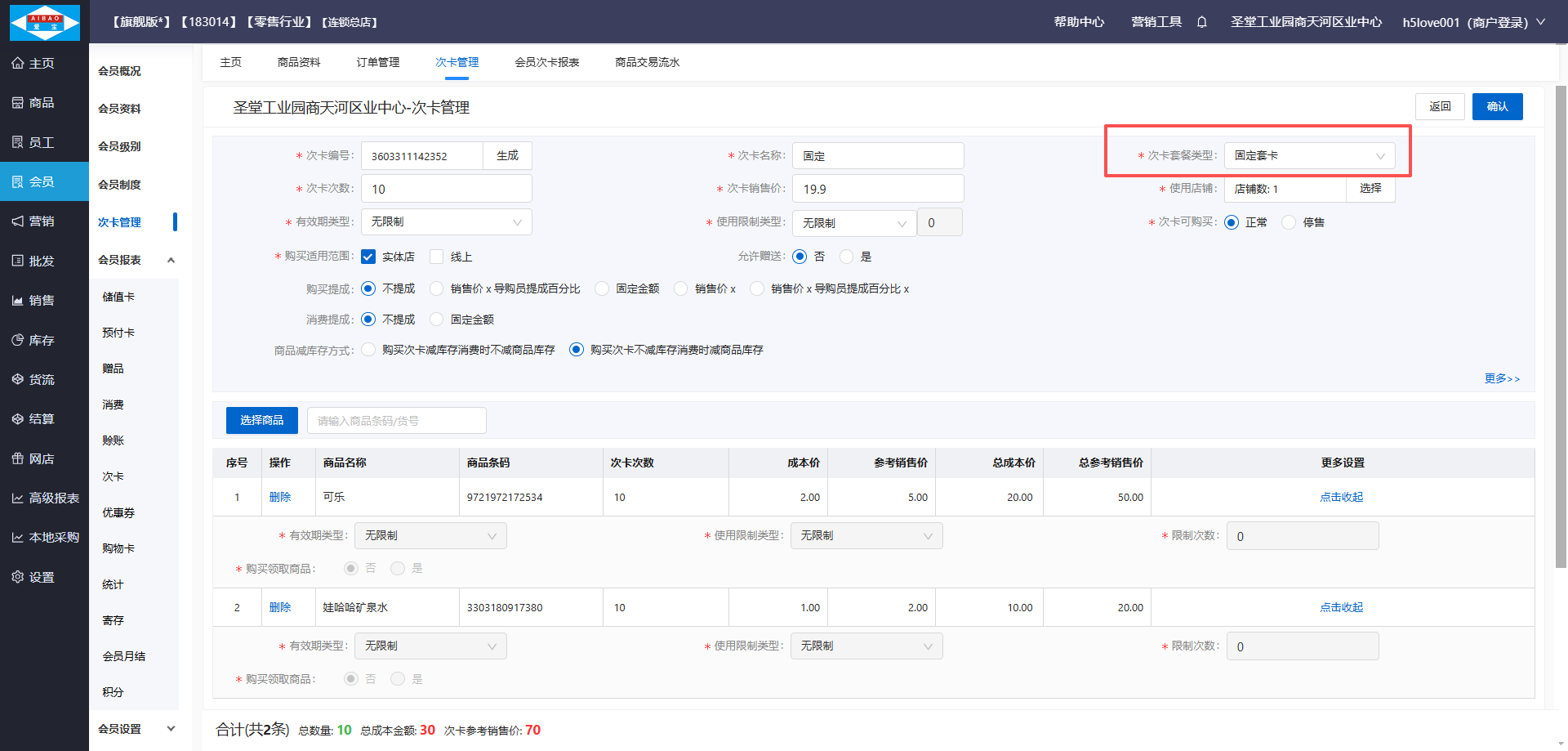 •选择类型名称为固定套卡的次卡