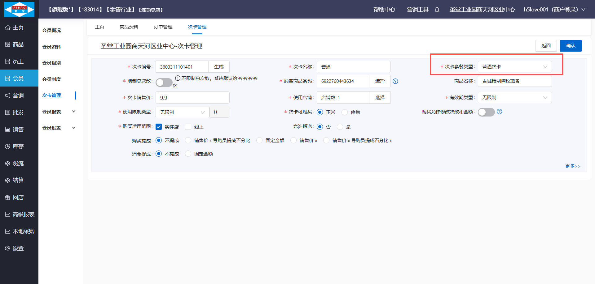 •选择类型名称为普通次卡的次卡