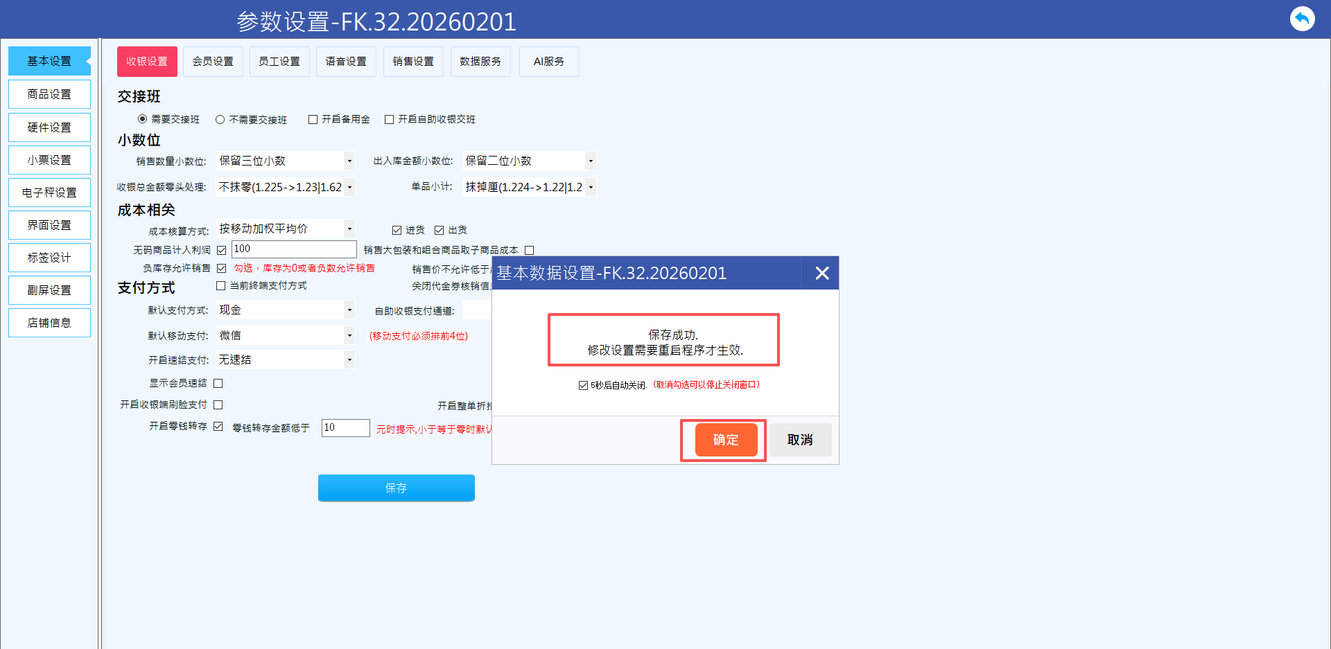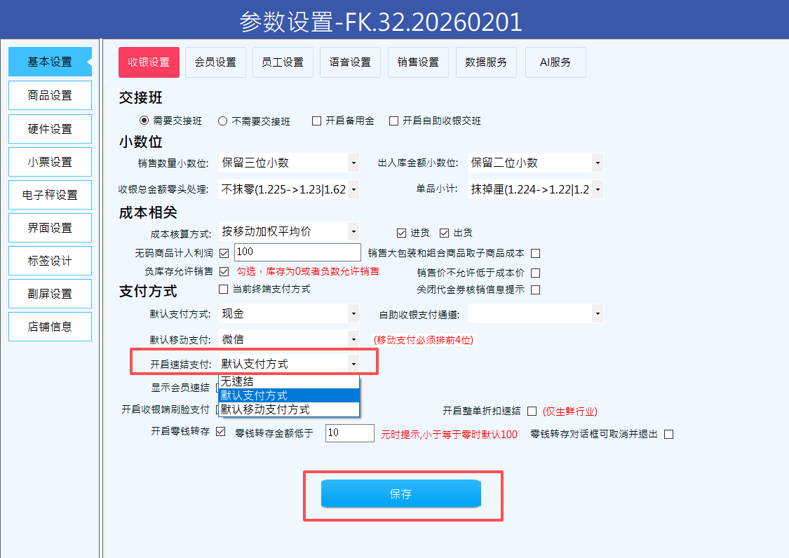 A: 可以。在参数设置中随时修改速结支付方式,修改后点击保存即可生效。
