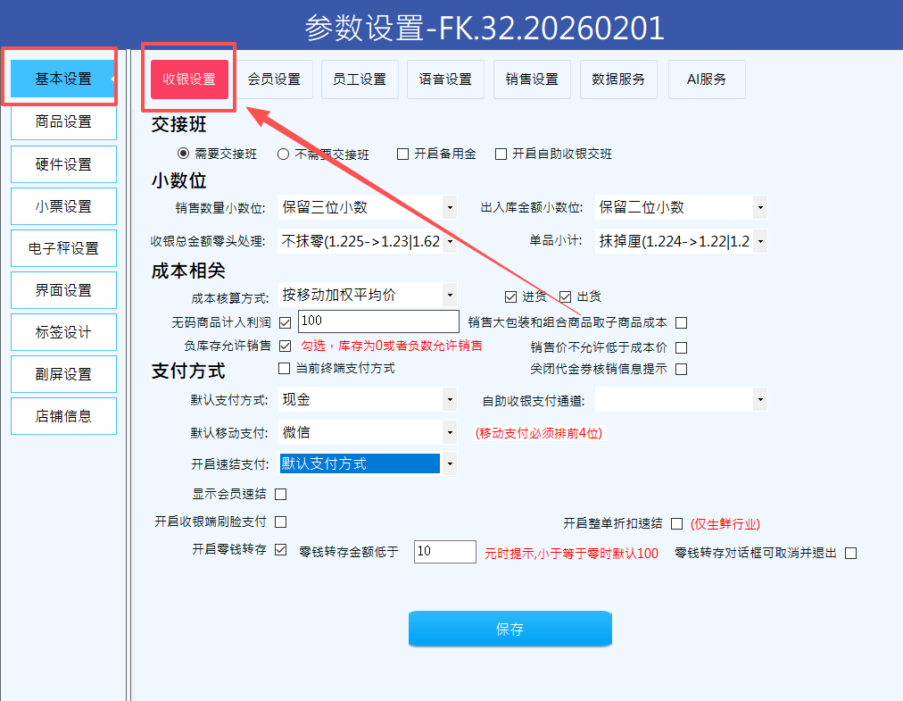 •点击【收银设置】标签页