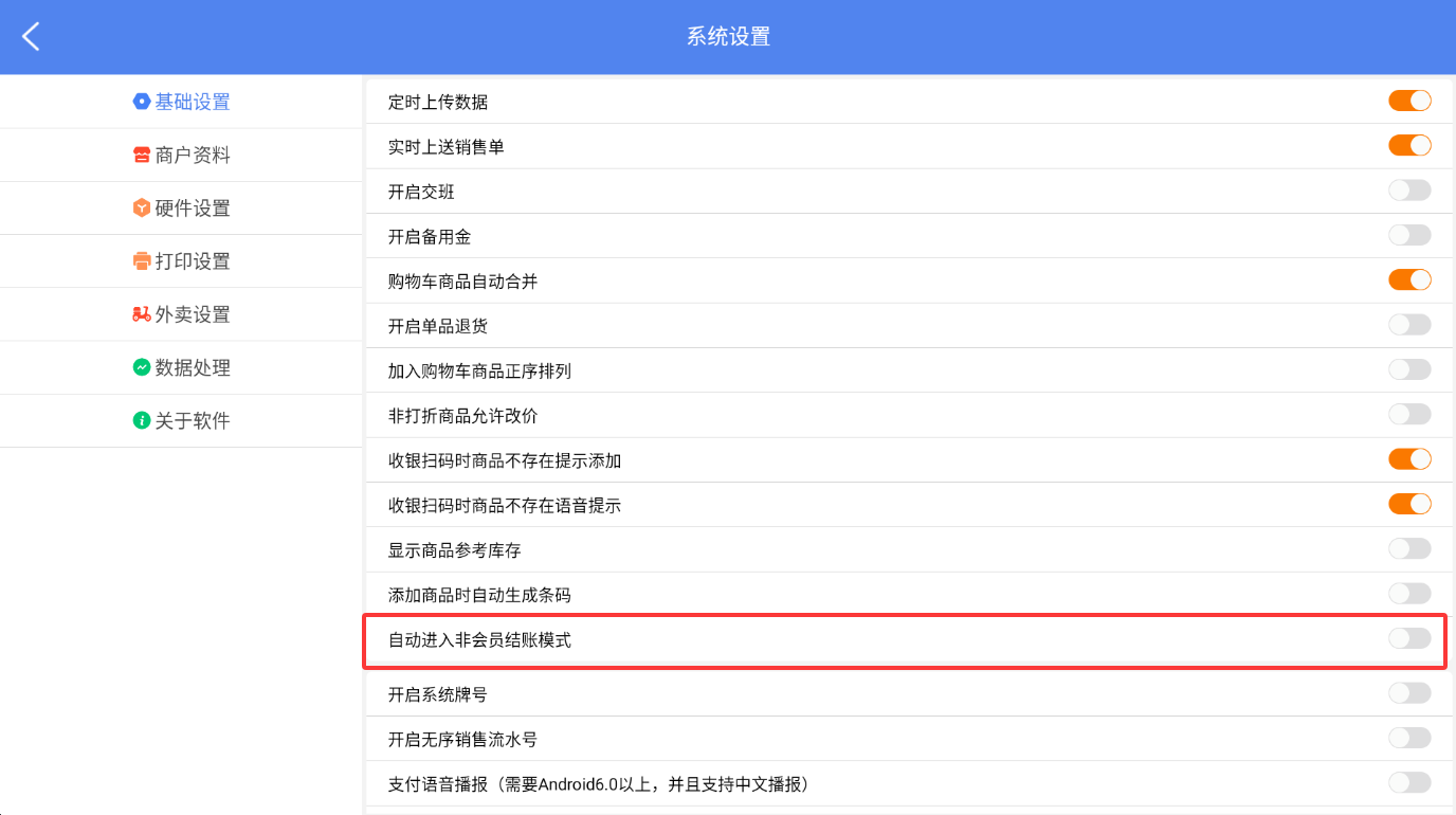 在设置列表中,找到“自动进入非会员结账模式”选项。