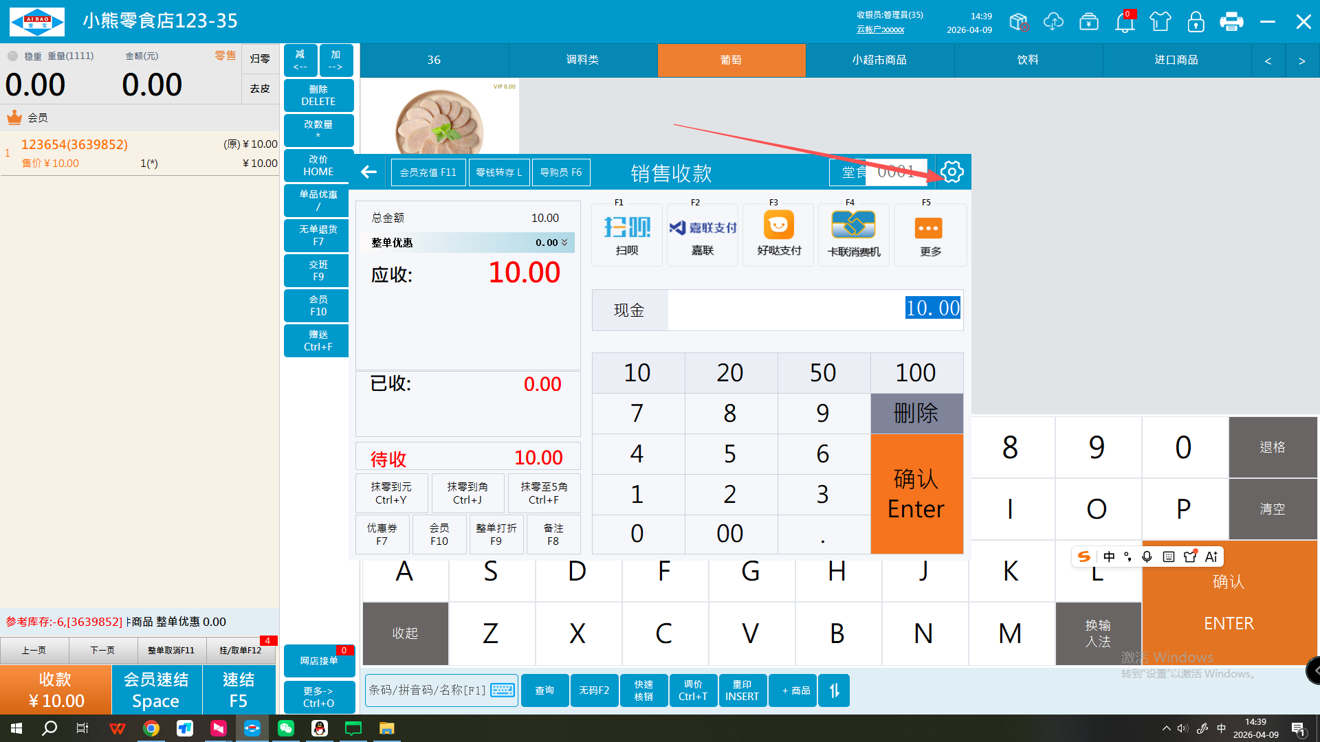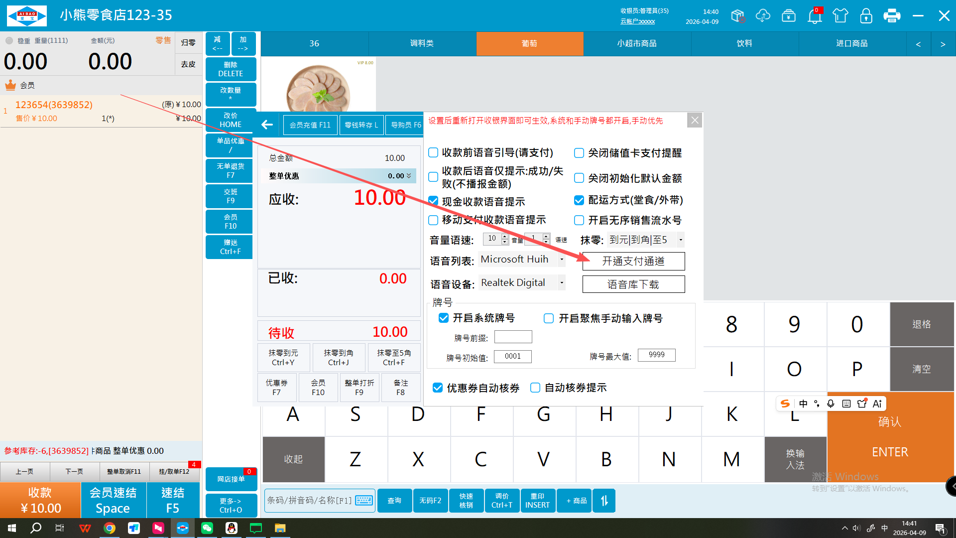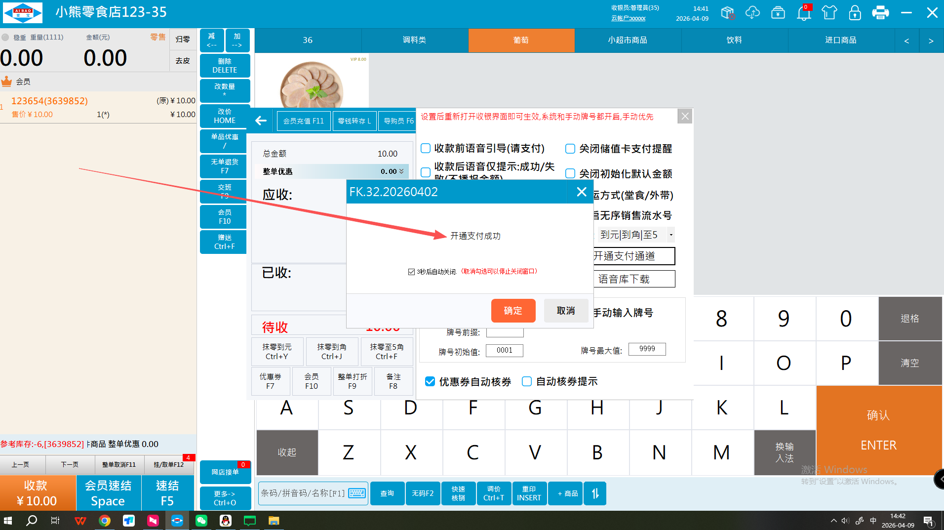 2、前台支付界面右上角齿轮进去点击开通支付通道即可同步支付配置信息
