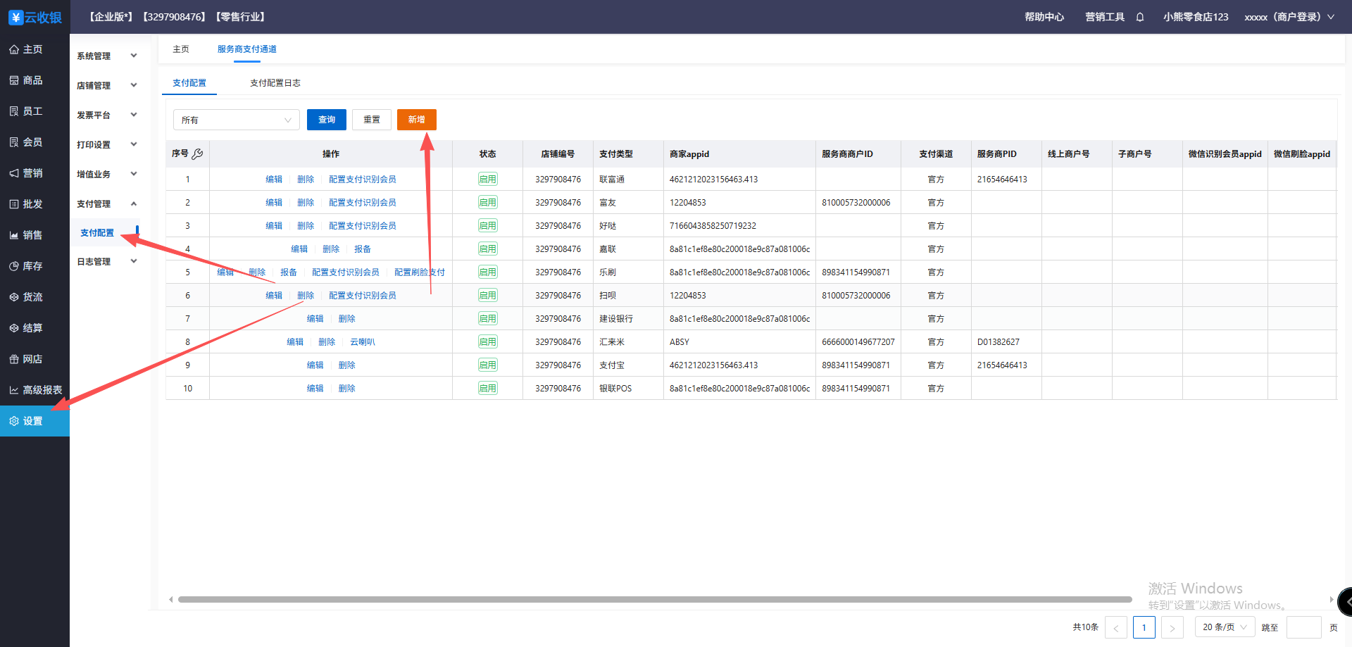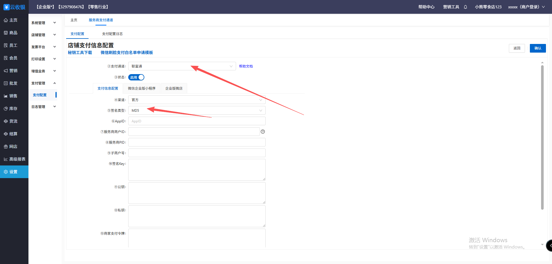 1、先在后台新增支付,选择好支付通道,填好对应的参数信息确认保存