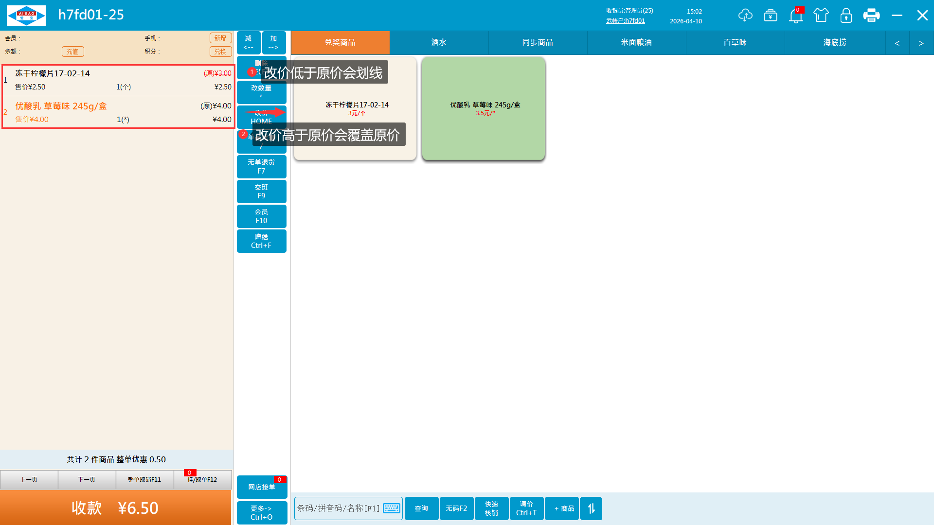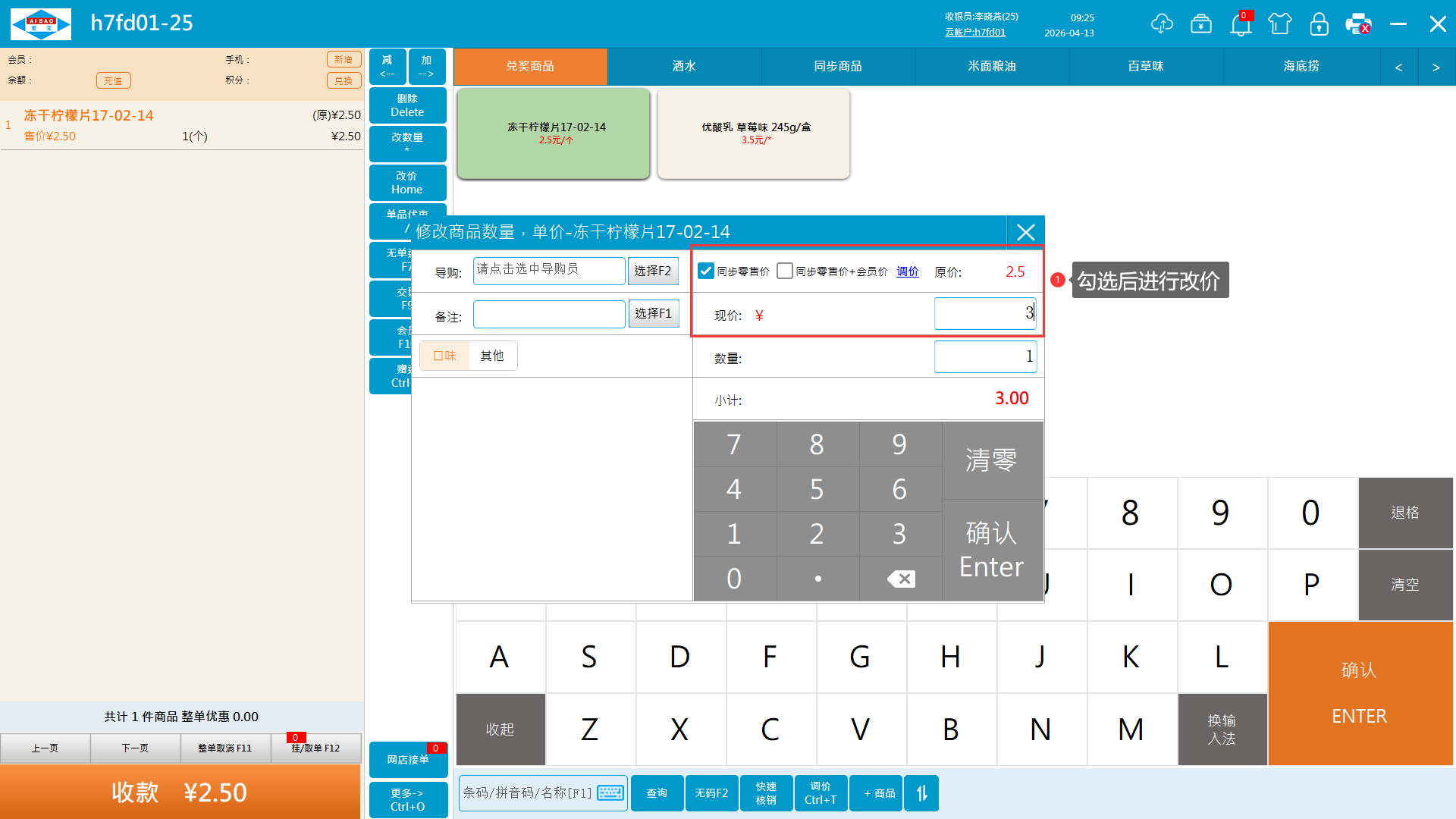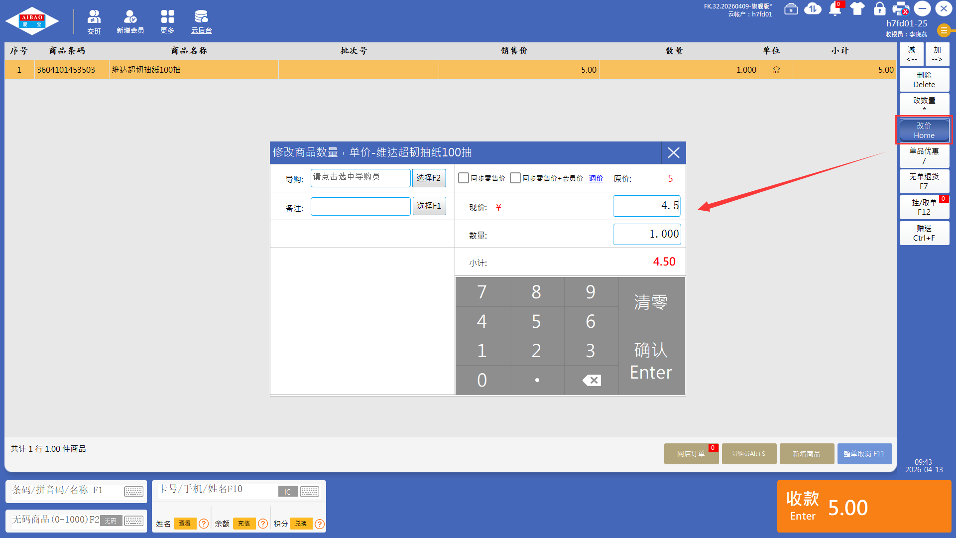 1、商品加入购物车,选择商品点击改价按钮(快捷键home),勾选同步零售价或同步零售价+会员价,输入现价,点击确认按钮。云后台商品资料的零售价与会员价会同步更改变更价格,多台收银机会同步改价后价格。