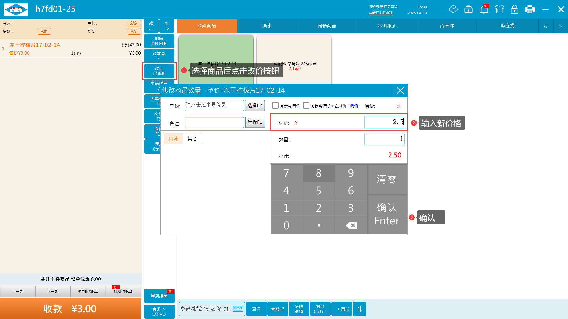 1、商品加入购物车,选择商品点击改价按钮(快捷键home),现价输入框输入新价格,点击确认按钮。非触屏版改价同理。