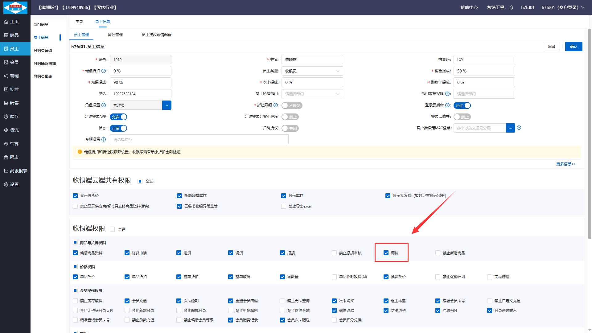进入员工-员工信息-员工管理页面,配置调价权限,勾上表示有权限。
