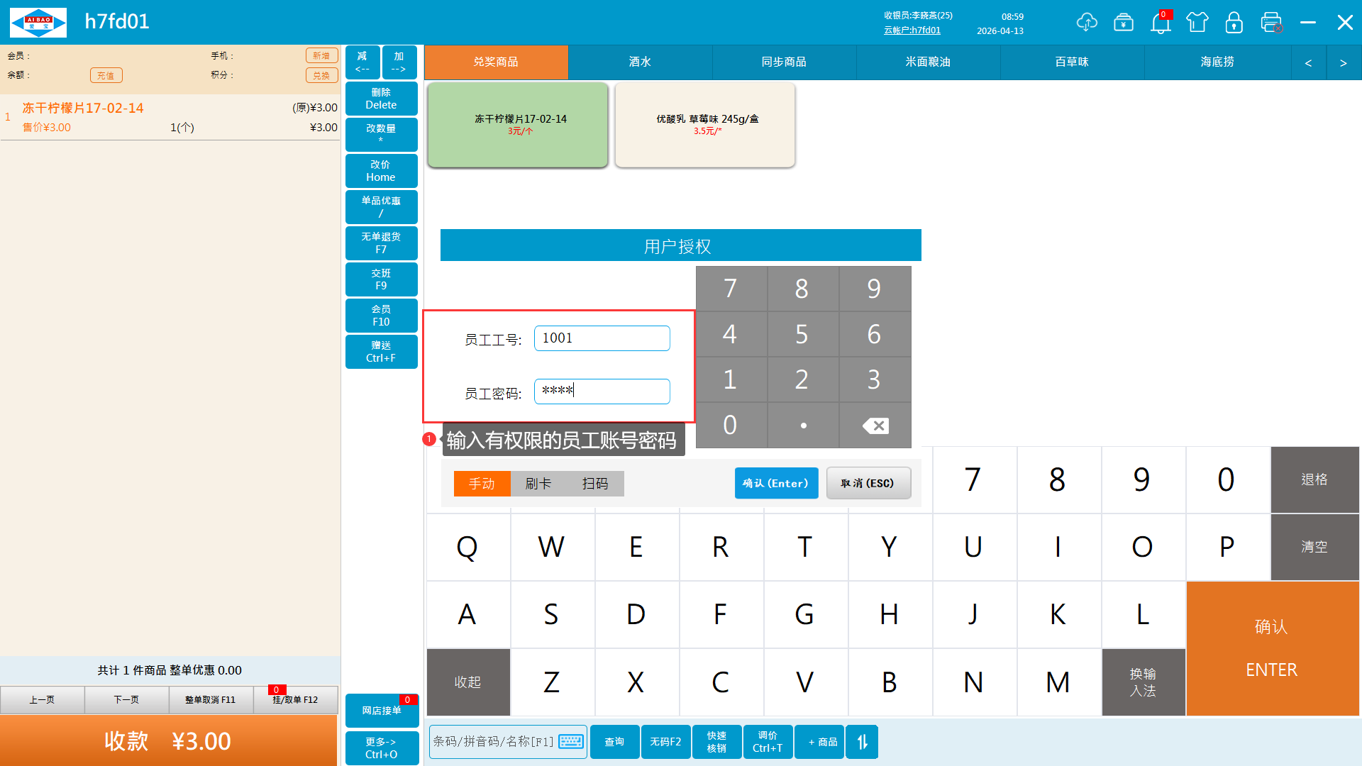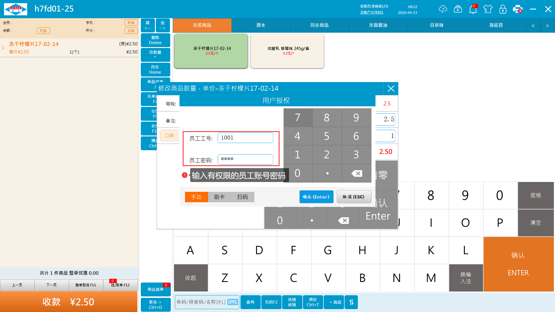 4、收银员无权限需要授权改价。需要输入有权限的员工账号密码授权。