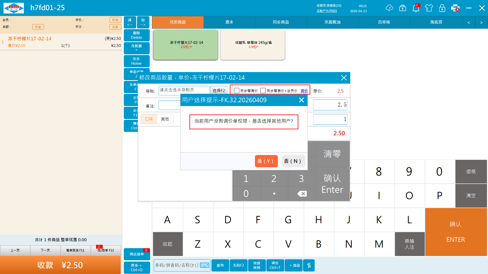 3、收银员无权限需要授权调价。需要输入有权限的员工账号密码授权。