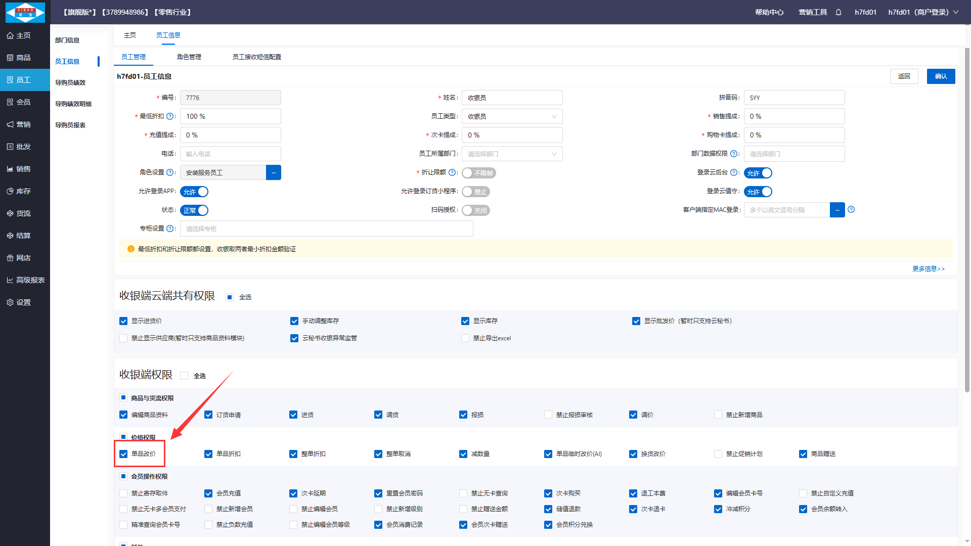进入员工-员工信息-员工管理页面,配置单品改价权限,勾上表示有权限。