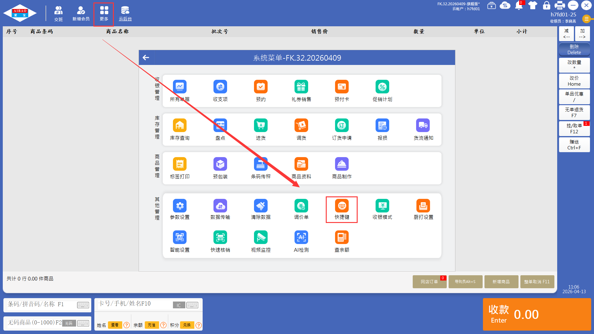 收银机为了简易方便操作,设置快捷键方便点击,简化收银流程。收银软件快捷键众多,难免记不住,故而有快捷键说明提示,也可修改自行常用按键。