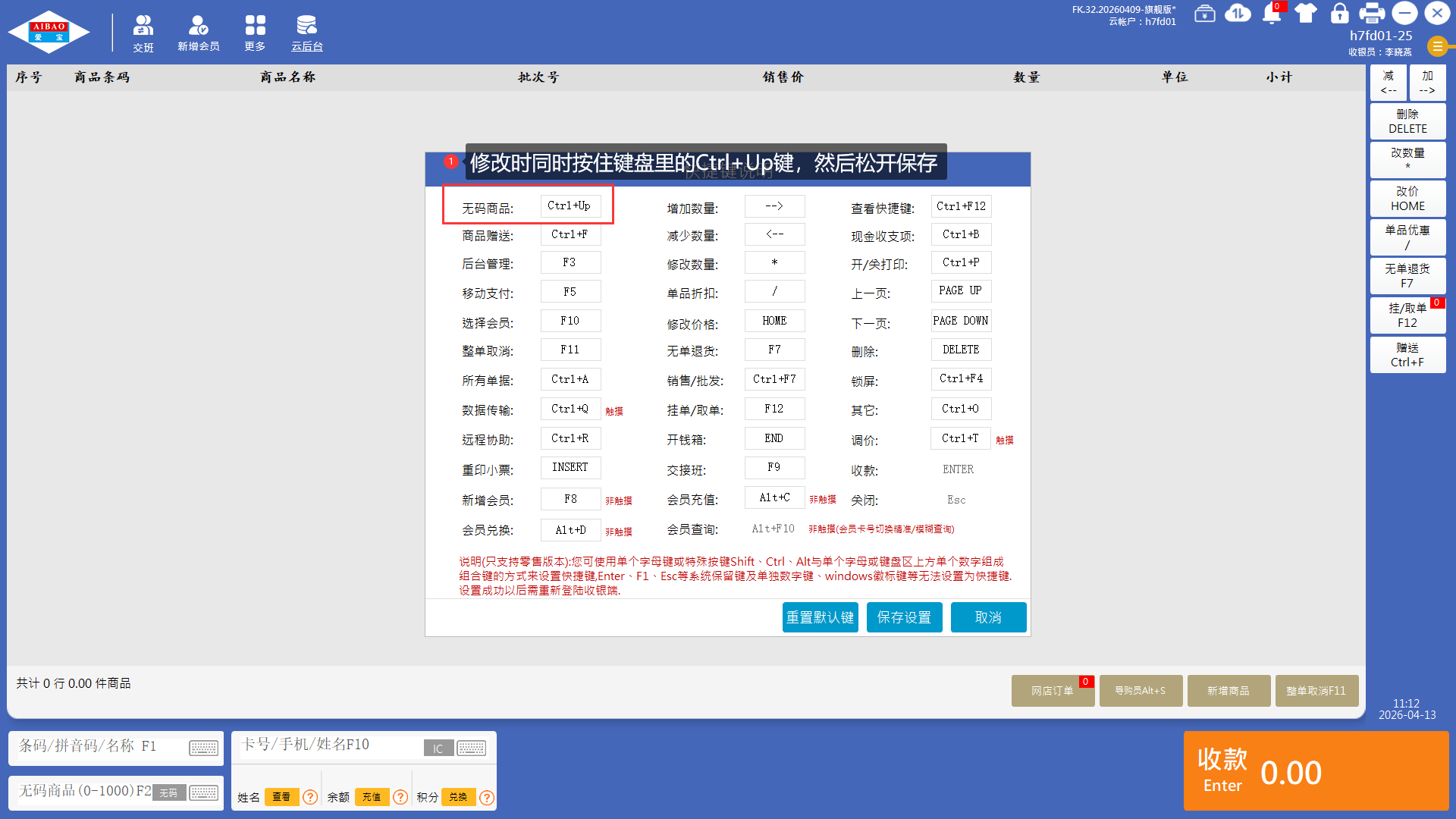 2、可对快捷键编辑修改保存。例如:修改无码商品时同时按住键盘里的Ctrl+Up键,然后松开保存。(注意:不是键盘里所有的按键都能进行使用)
