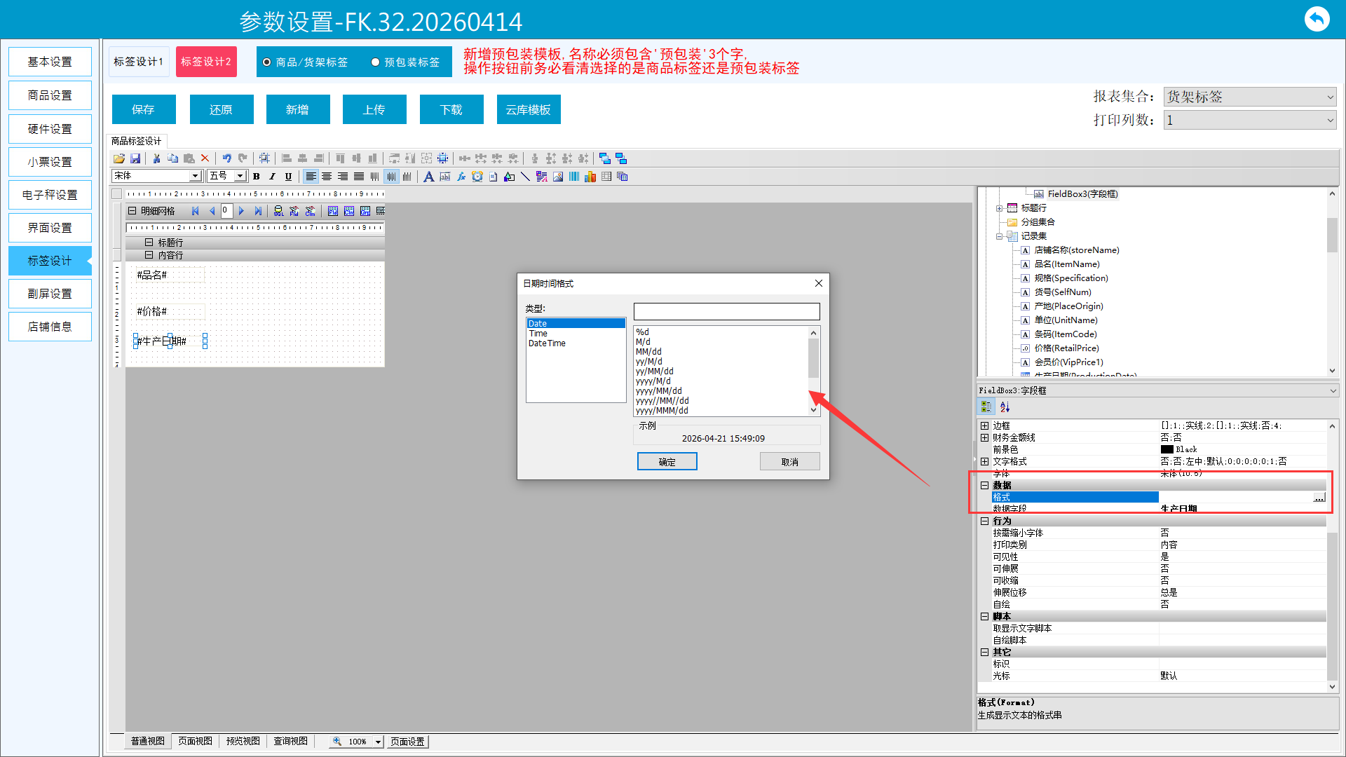 5.2回到单个参数设置区,格式里点击…弹出框选择需要的时间格式保存即可。