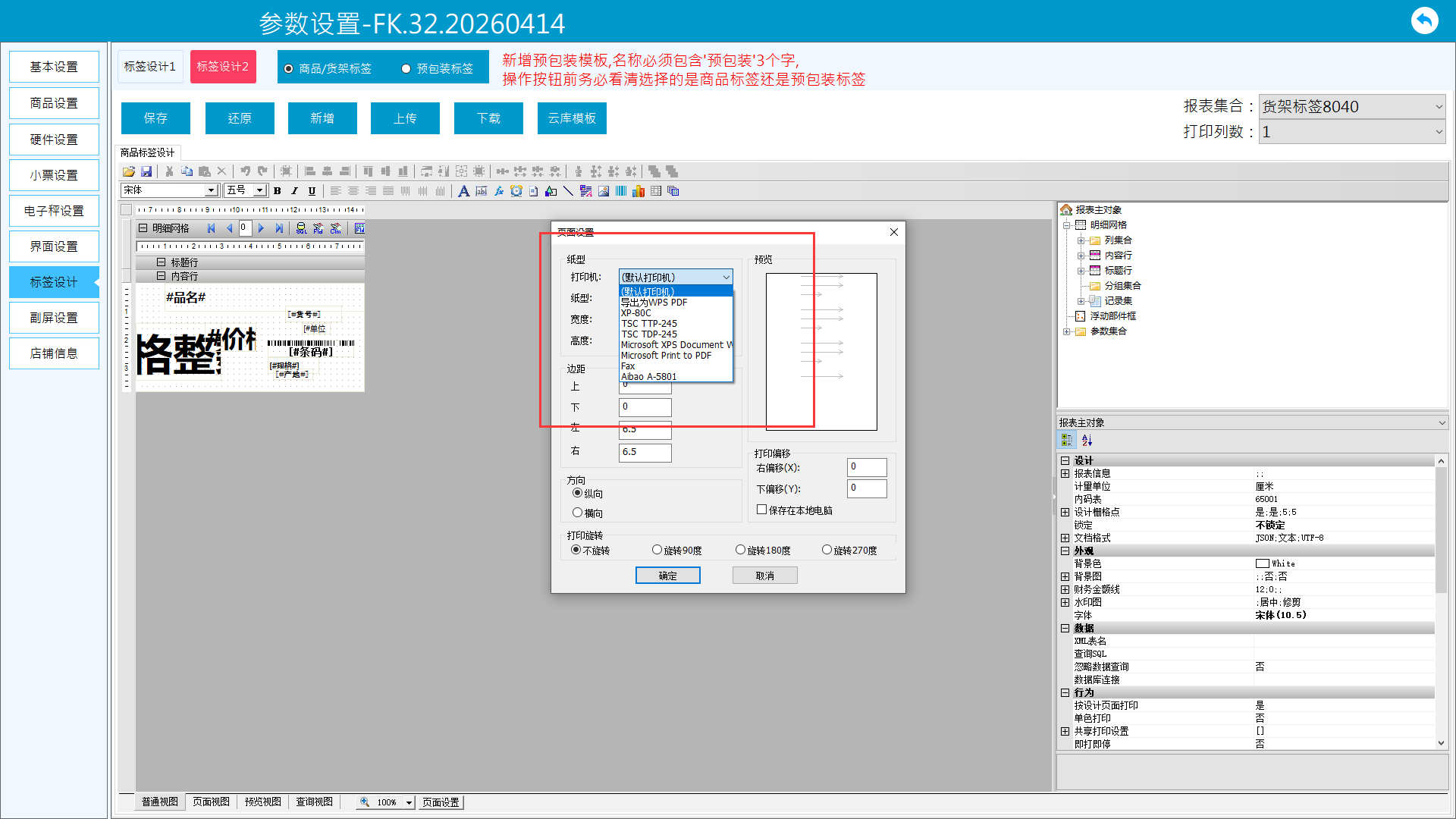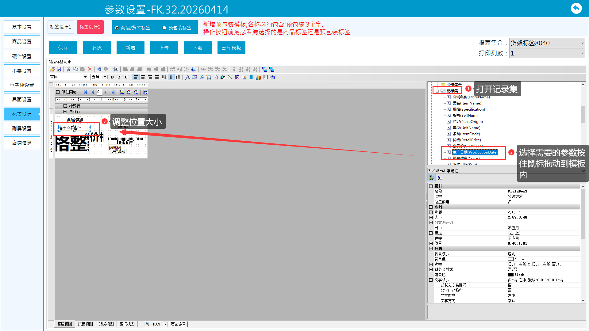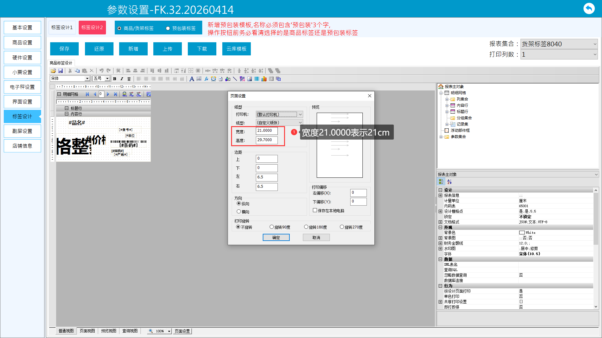 对于需要调整的打印参数,若模板没有,可手动添加或者修改,也可自定义样式位置大小。版面说明: