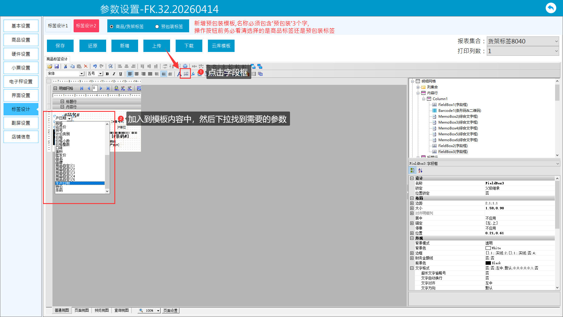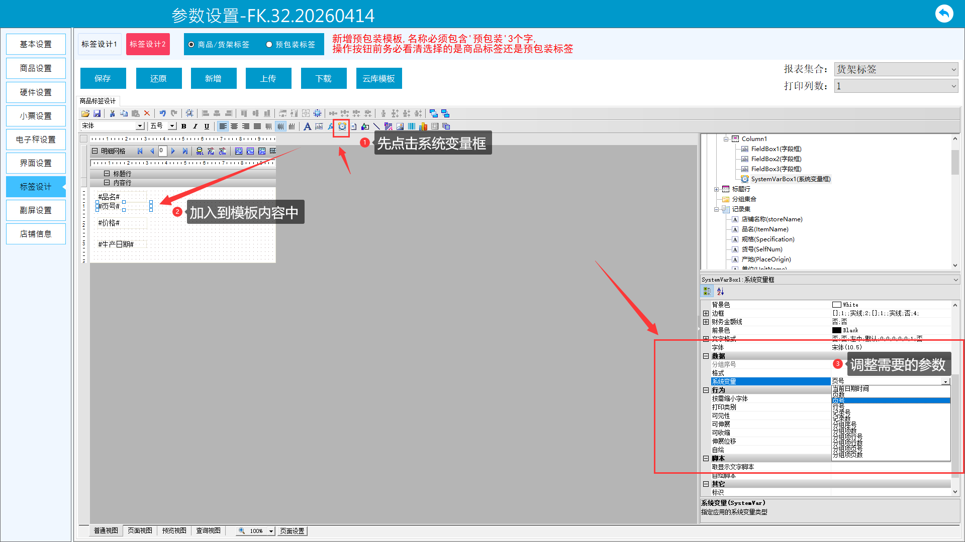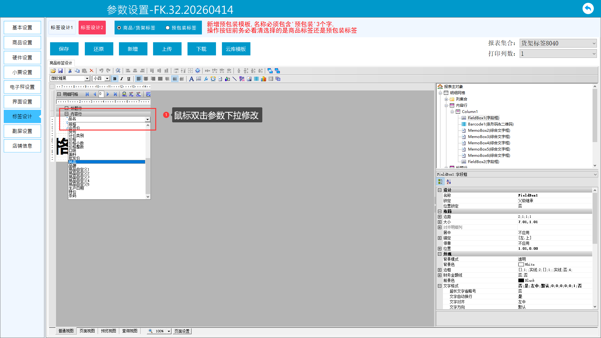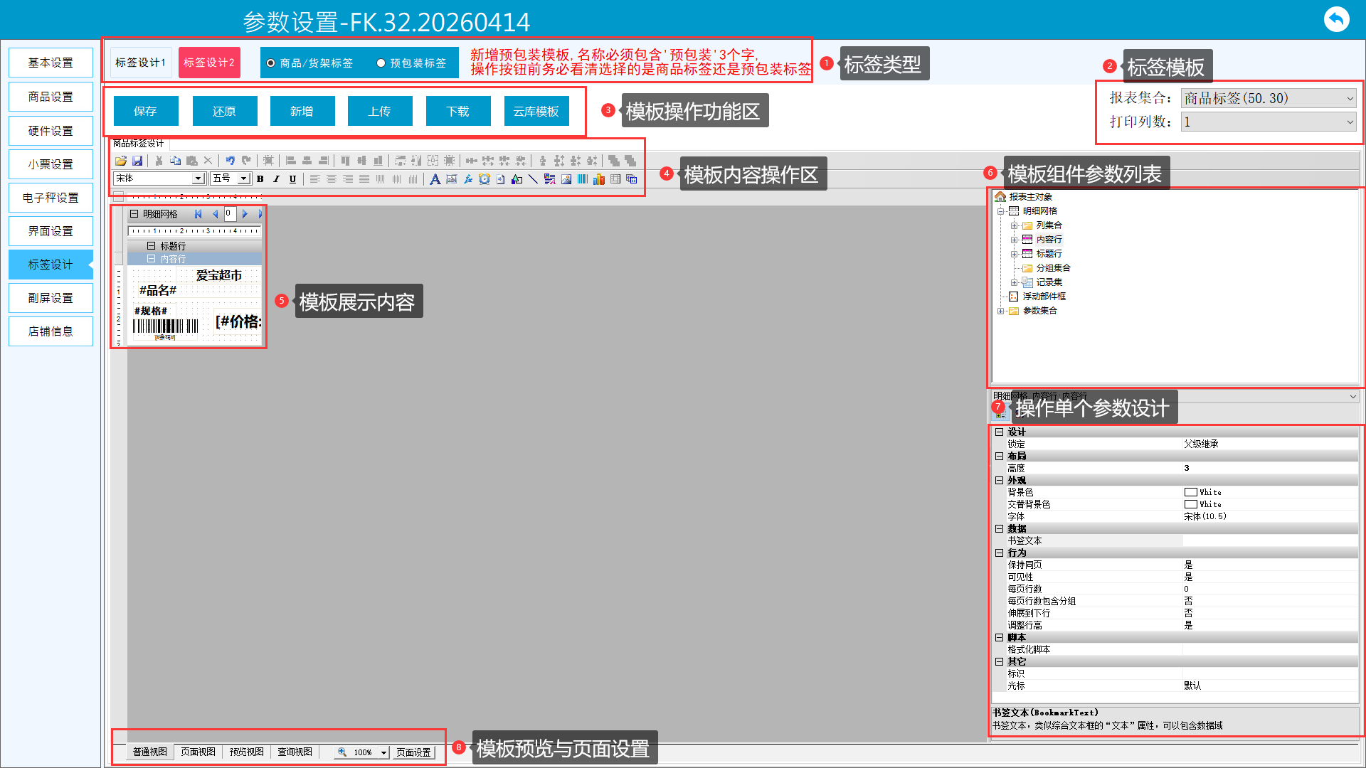 对于需要调整的打印参数,若模板没有,可手动添加或者修改,也可自定义样式位置大小。版面说明: