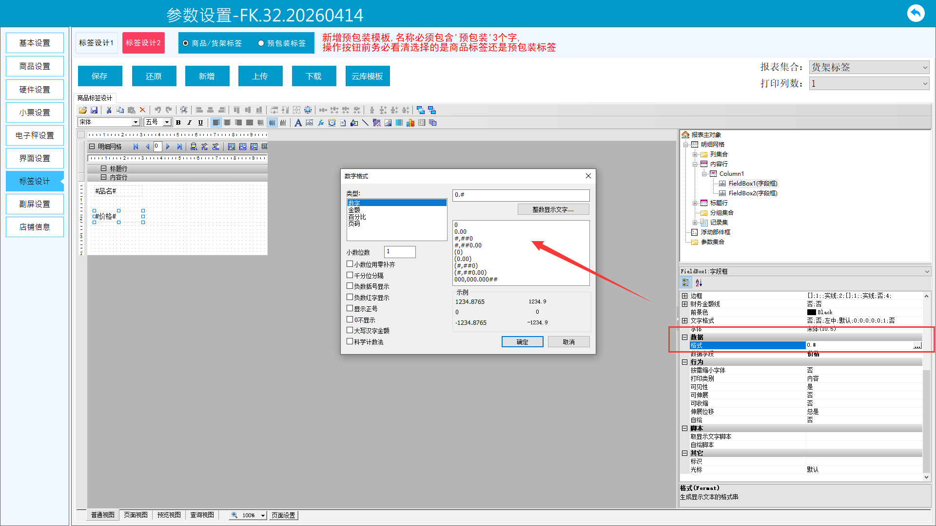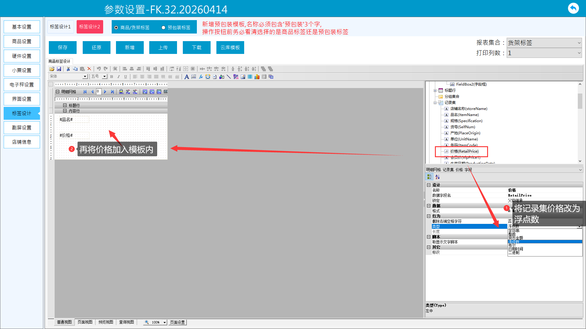 4、价格小数位。记录集中找到价格参数,修改类型为浮点数,然后将价格加入到模板内容中,然后调整数字格式。
