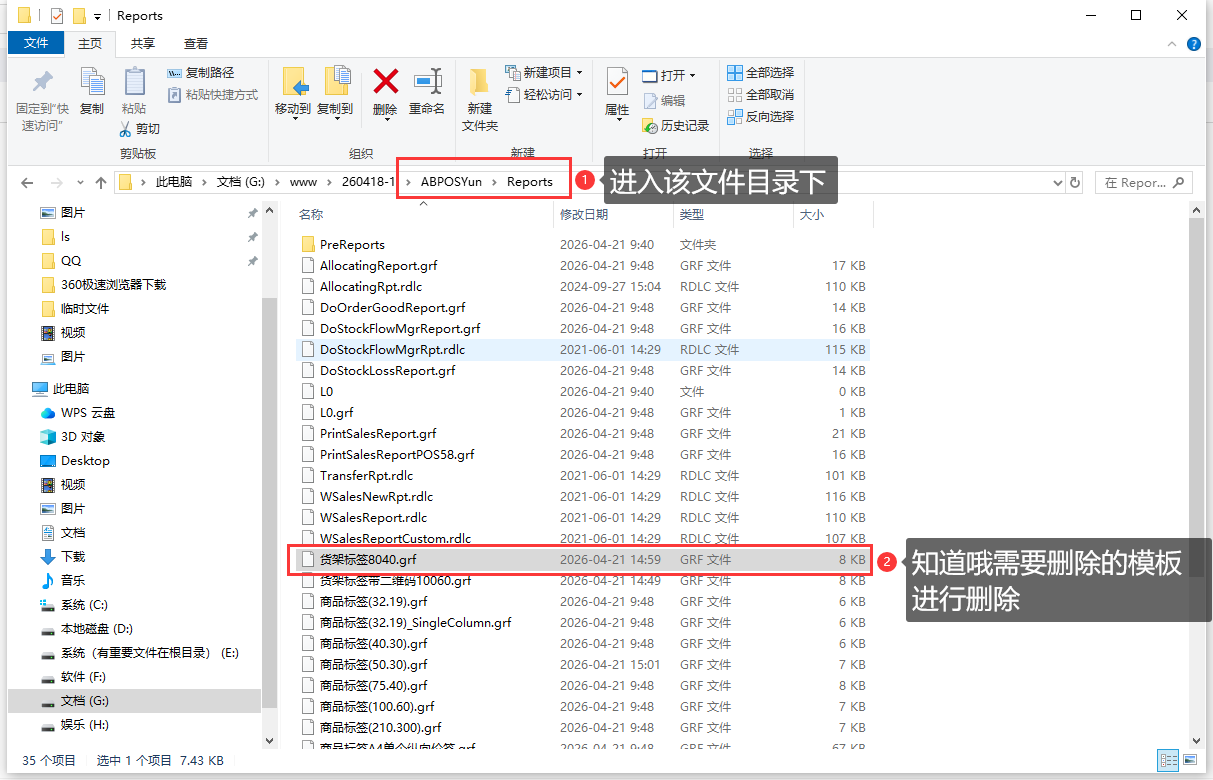 1、进入文件安装目录\ABPOSYun\Reports下,找到需要删除的模板进行删除。