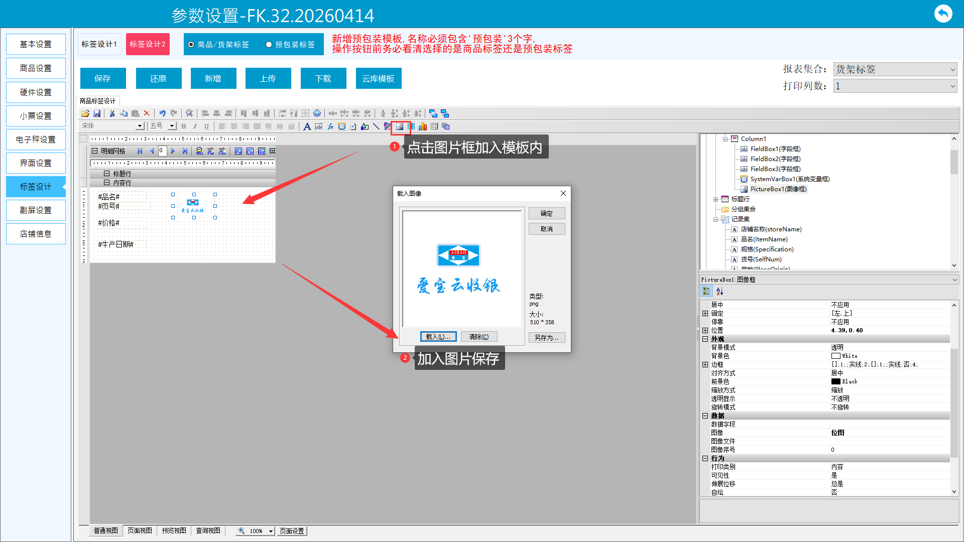 7、增加图片参数。选择图片框,加入模板内容后双击打开参数,载入图片选择需要的图片保存。