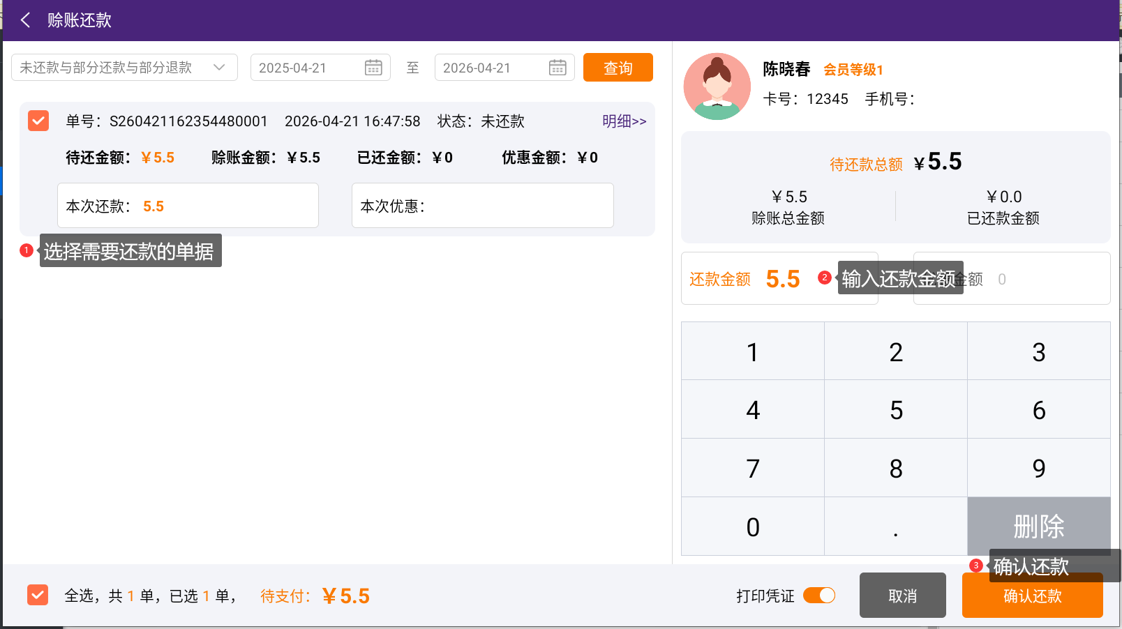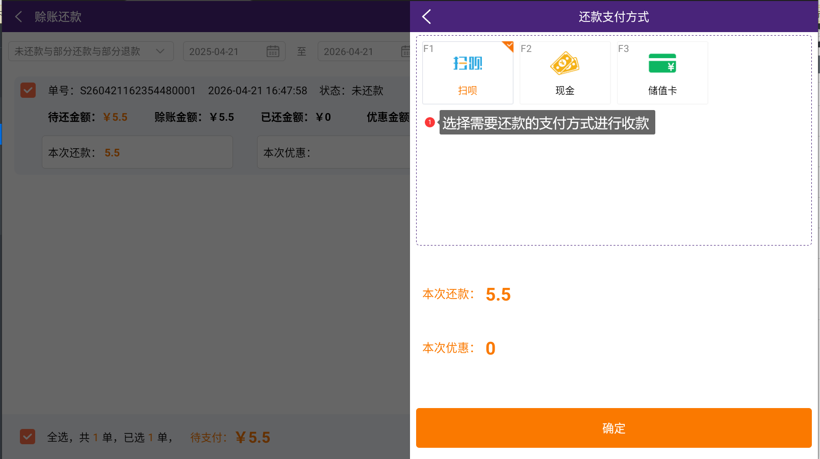 【操作步骤】输入需赊账还款会员号查询,点击赊账查看按钮,勾选单据,输入还款金额,点击确认还款,选择还款支付方式,点击确定即可完成赊账还款。