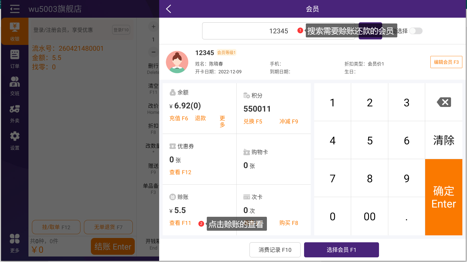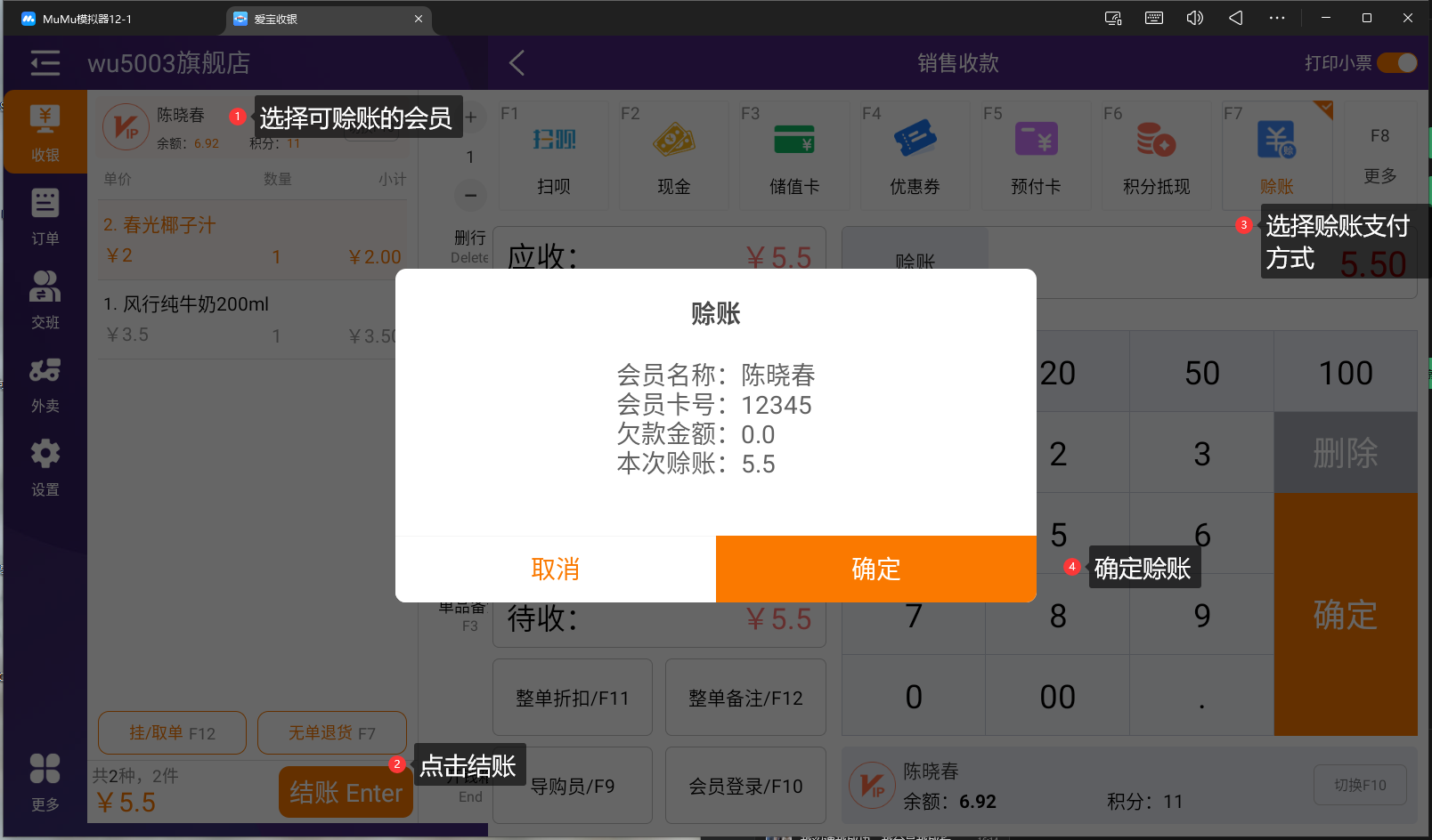 【操作步骤】前台收银选择允许赊账的会员,结账时选择赊账支付方式,点击赊账弹窗的确定按钮即完成赊账。