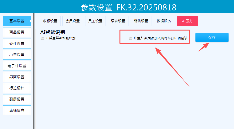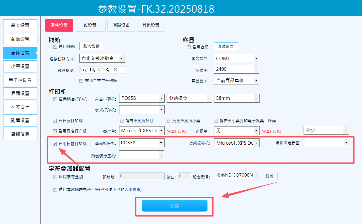 第一步:打开爱宝云收银--【参数设置】--【硬件设置】--勾选【启用标签打印机】,设置好打印机驱动--【保存】