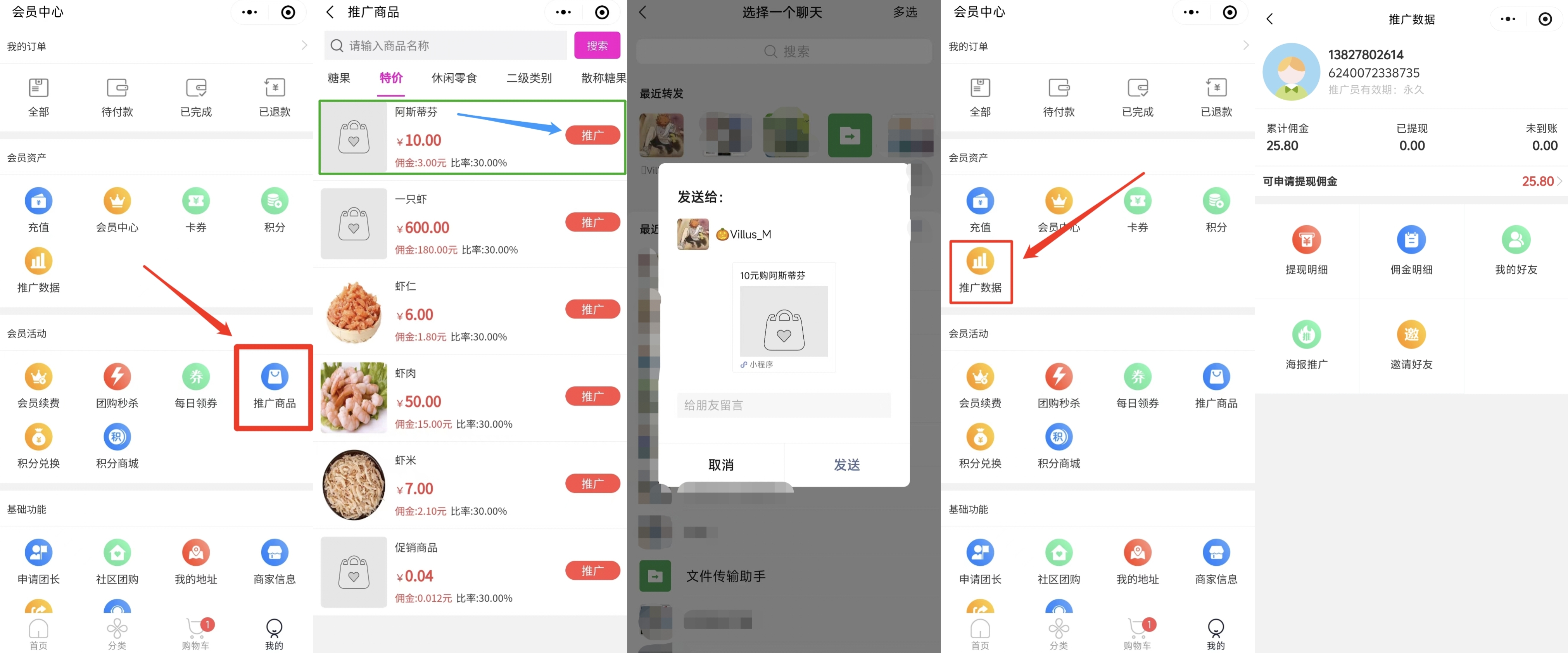 如下图,点击【推广商品】图标,在第二步中设置了佣金比率的商品将会出现在此页,将商品推广信息发送给微信好友,微信好友通过该链接注册成为会员并且购买该商品后,该好友则成为推广员的下级会员,推广员可获取对应佣金,此后该名好友在店铺购买支持返佣的商品,推广员都会获得对应佣金,推广员点开推广数据就可以看到推广员的佣金