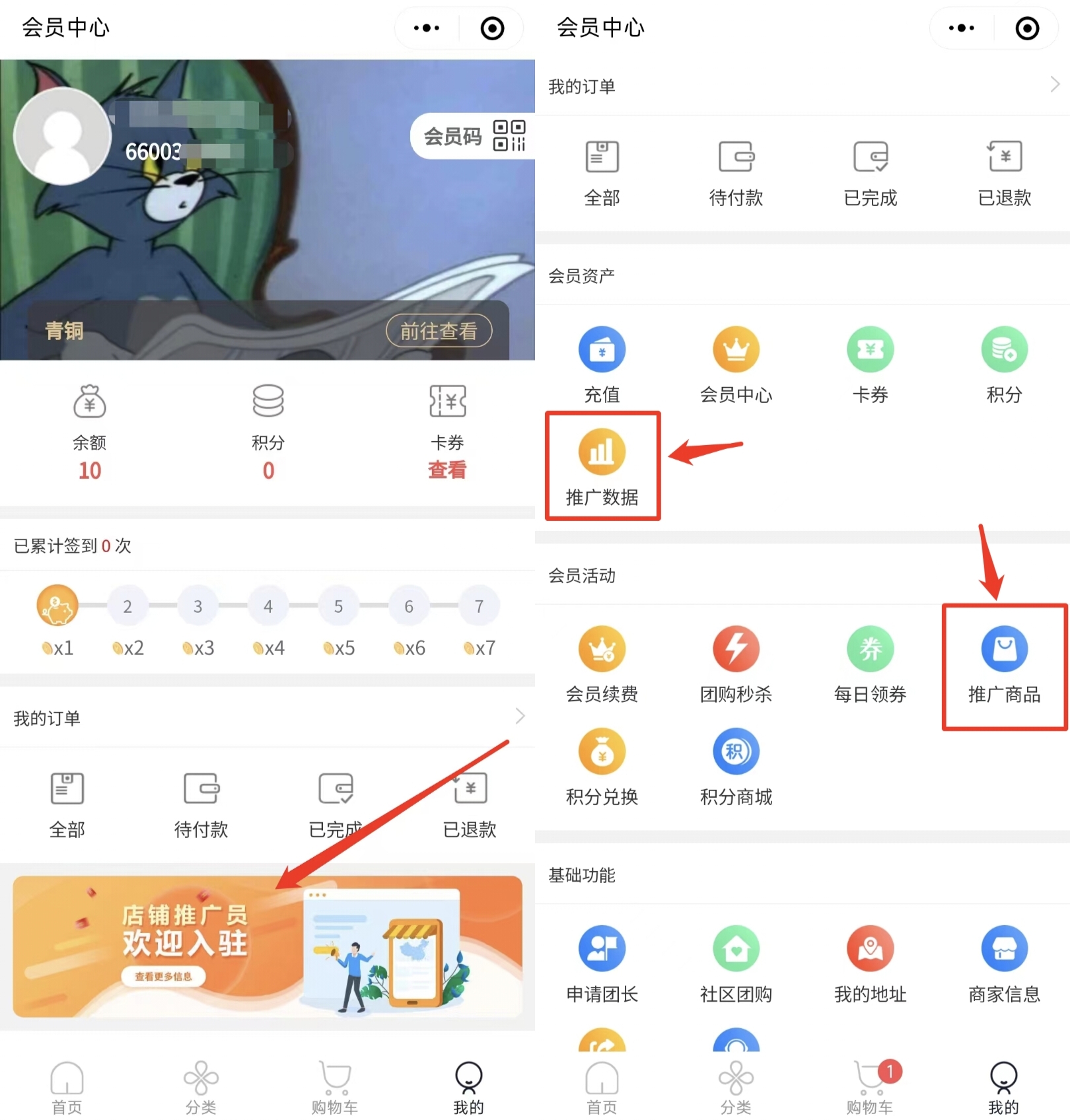 登录店铺小程序,点击右下方【我的】,点击推广员广告,支付费用即可成为推广员,成为推广员后,会员中心出现推广数据以及推广商品两个入口