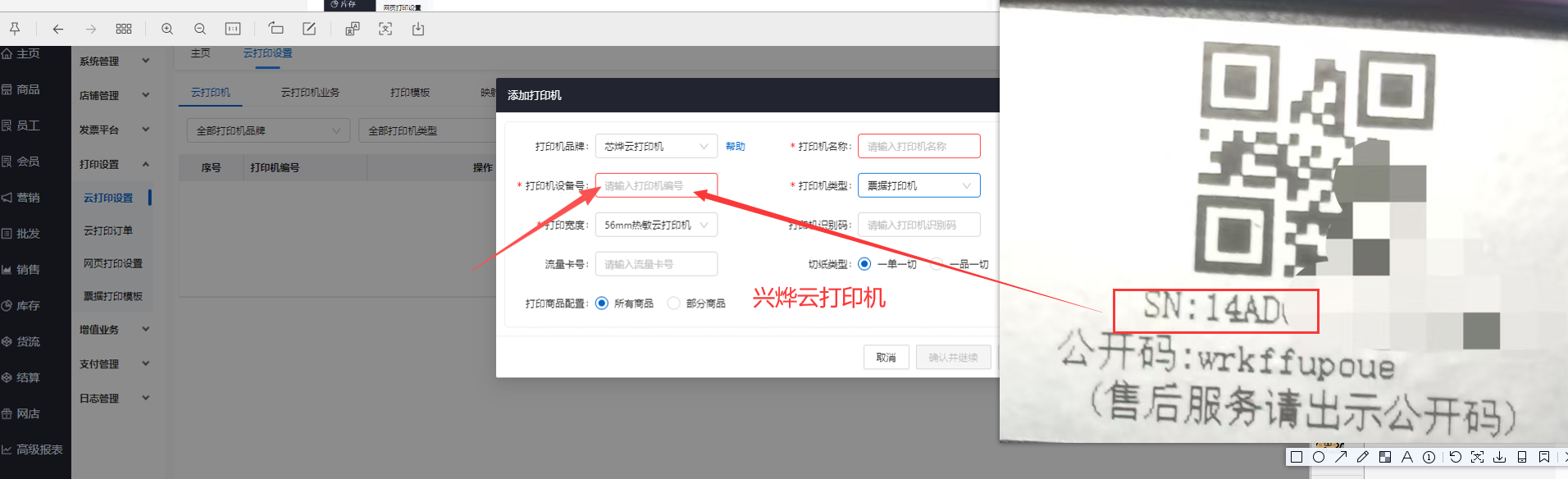 芯烨云打印机设备打印机设备号:即每个云打印机的SN码,如下图所示