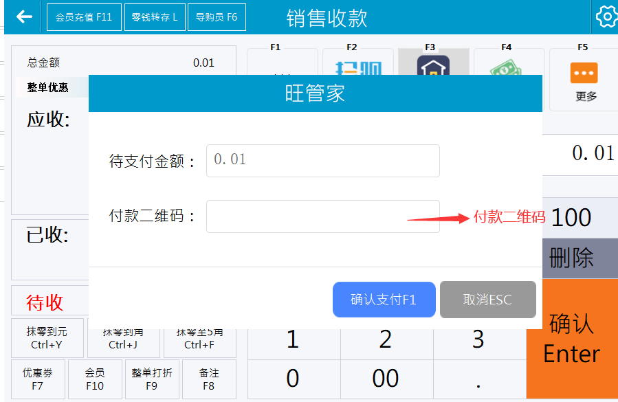 5.前台收款,选用【旺管家】支付,测试是否正常支付