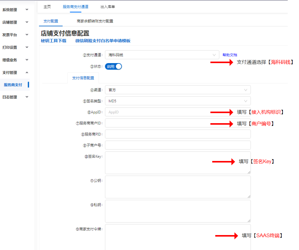 3.按照下图,进行配置【海科码钱】通道信息:
