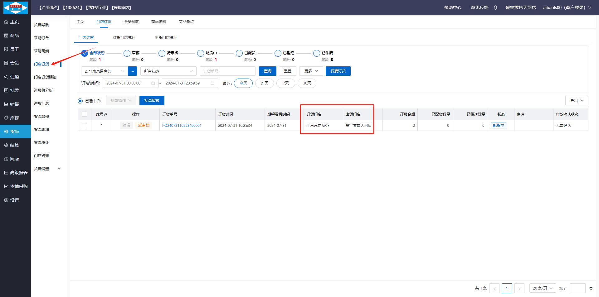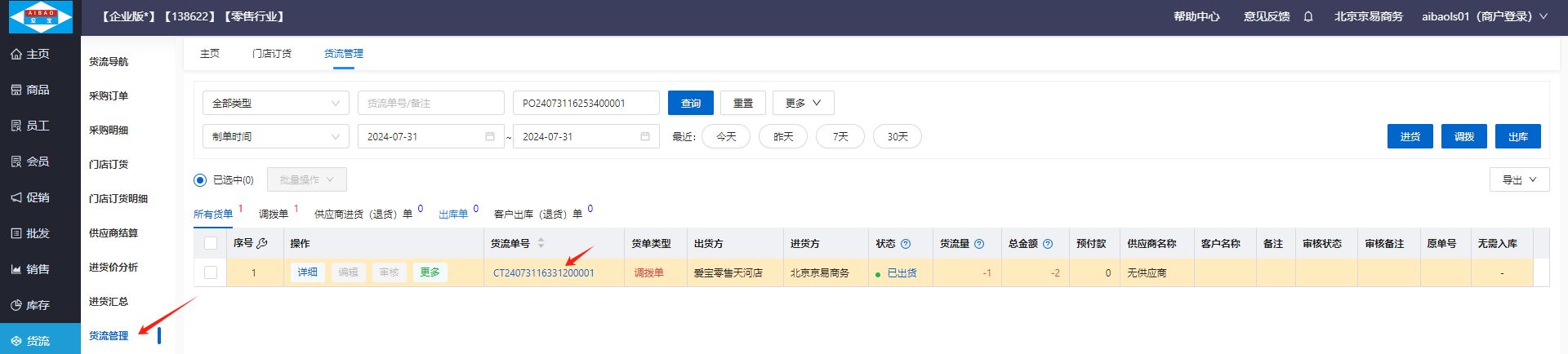 分店进入货流管理的调拨单收货