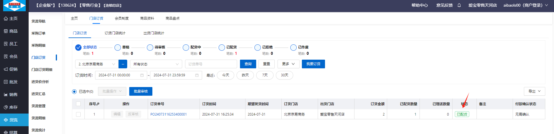 配货后,分店后台显示已配货