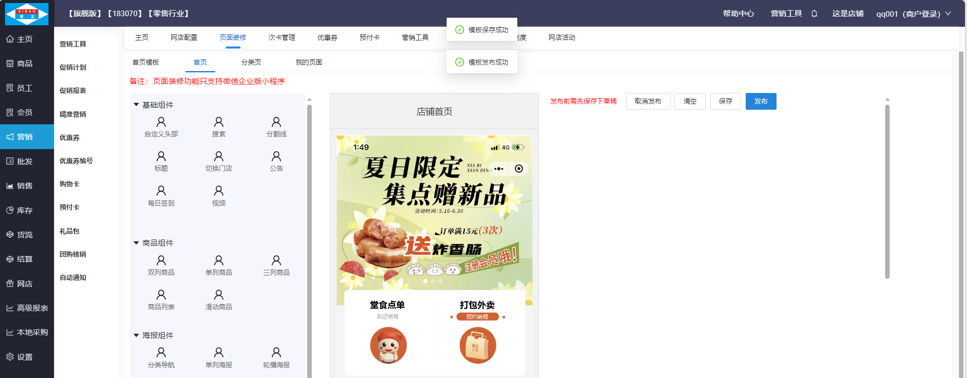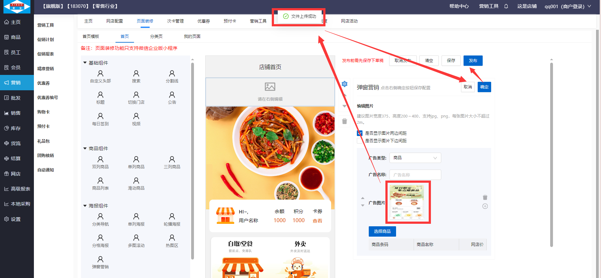 将弹窗营销的组件拖至装修区,并点击弹窗营销,上传广告图片,可选择广告类型,小程序点击弹窗广告后可以跳转到对应的广告类型