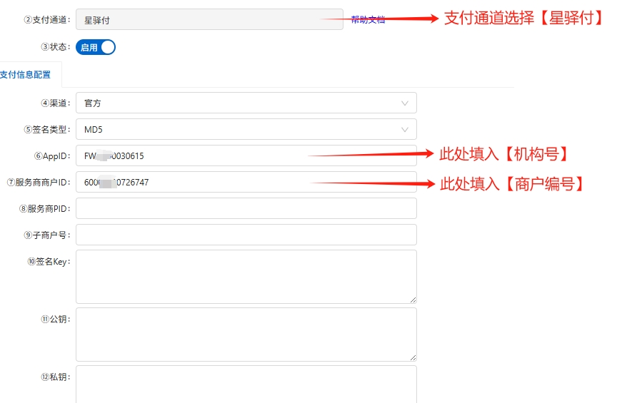 3.按照下图,进行配置【星驿付】通道信息: