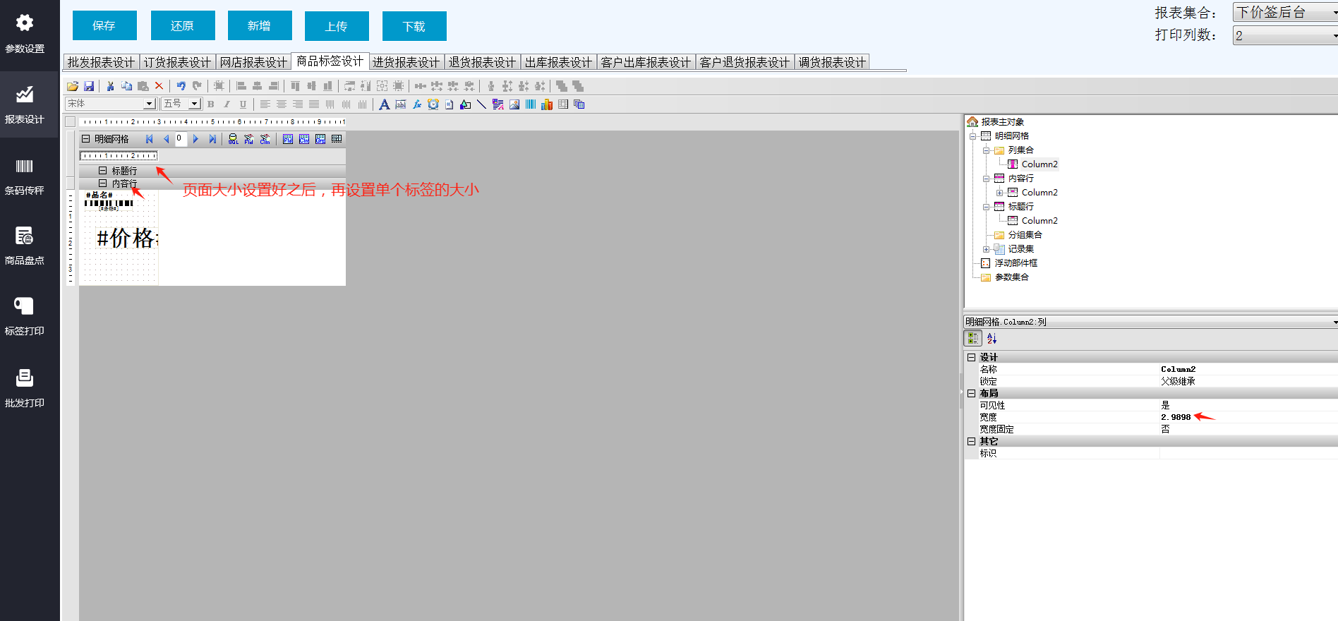 多列标签设置:(不干胶打印)打印机驱动里面设置整张纸大小,软件里面设置单个标签大小 和相对应的列数