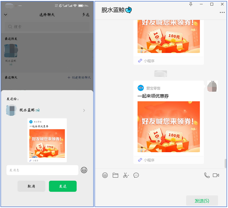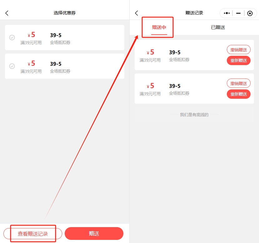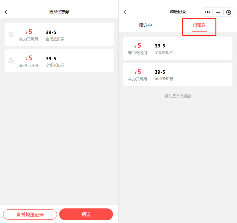 赠送记录:好友领取了赠送的优惠券,优惠券则处于“已赠送”状态