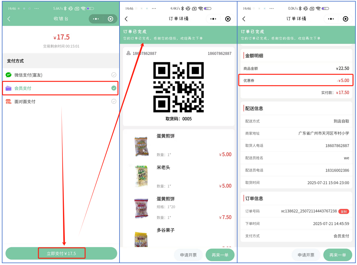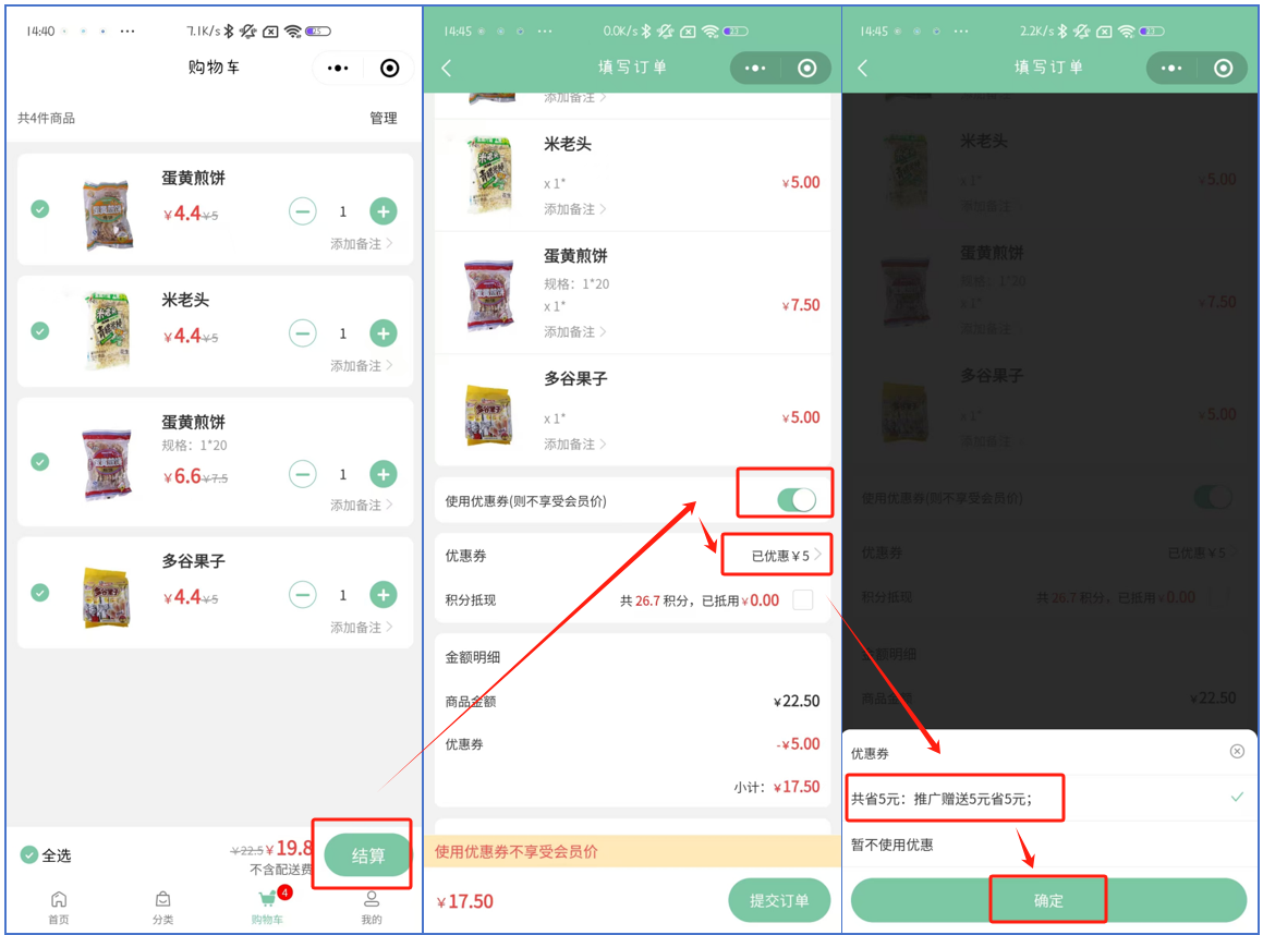 注:使用优惠券需根据优惠券的核销范围进行使用,可线上核销下单,也可实体店核销下单,此处演示线上核销下单