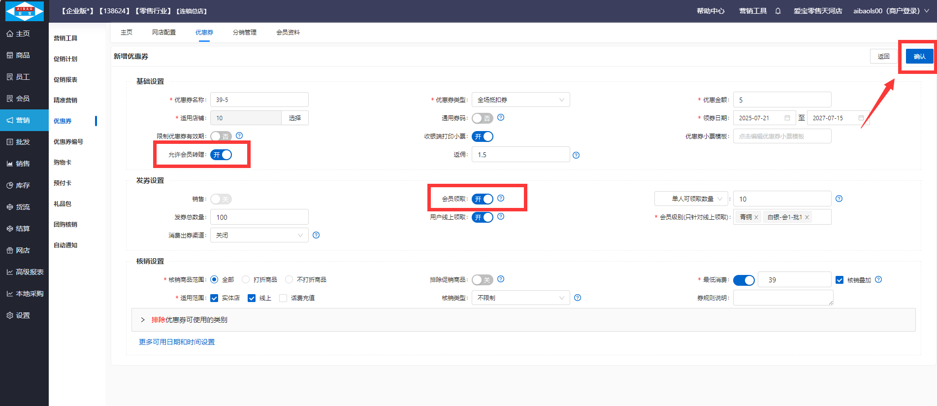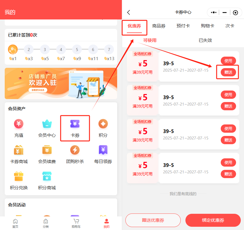 其中,若优惠券允许赠送,则必须开启允许会员转赠