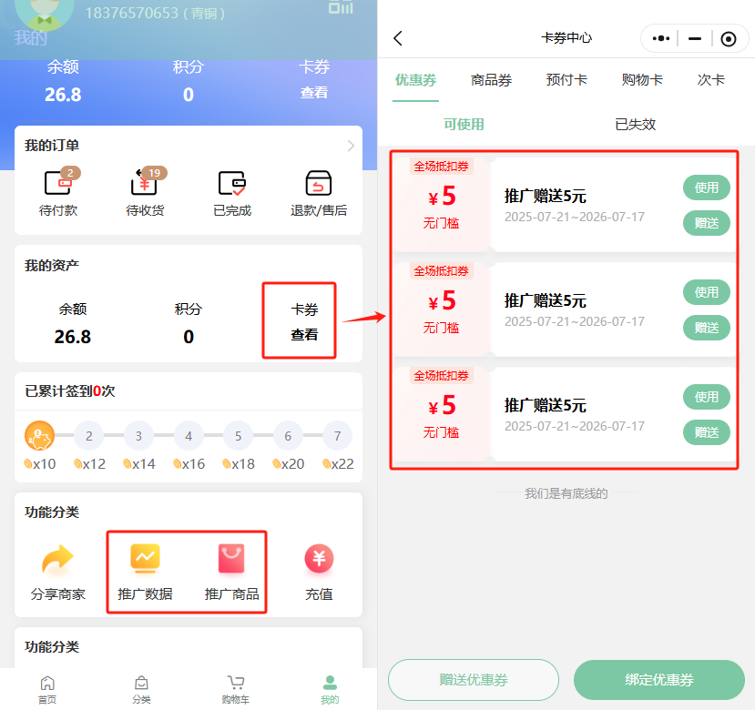 成为推广员后,可以查看推广商品和推广数据,并获取推广员入驻设置的优惠券奖励