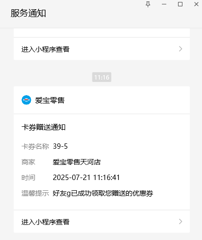 好友领取会员赠送的优惠券后,会员接收到好友成功领取赠送优惠券的服务通知