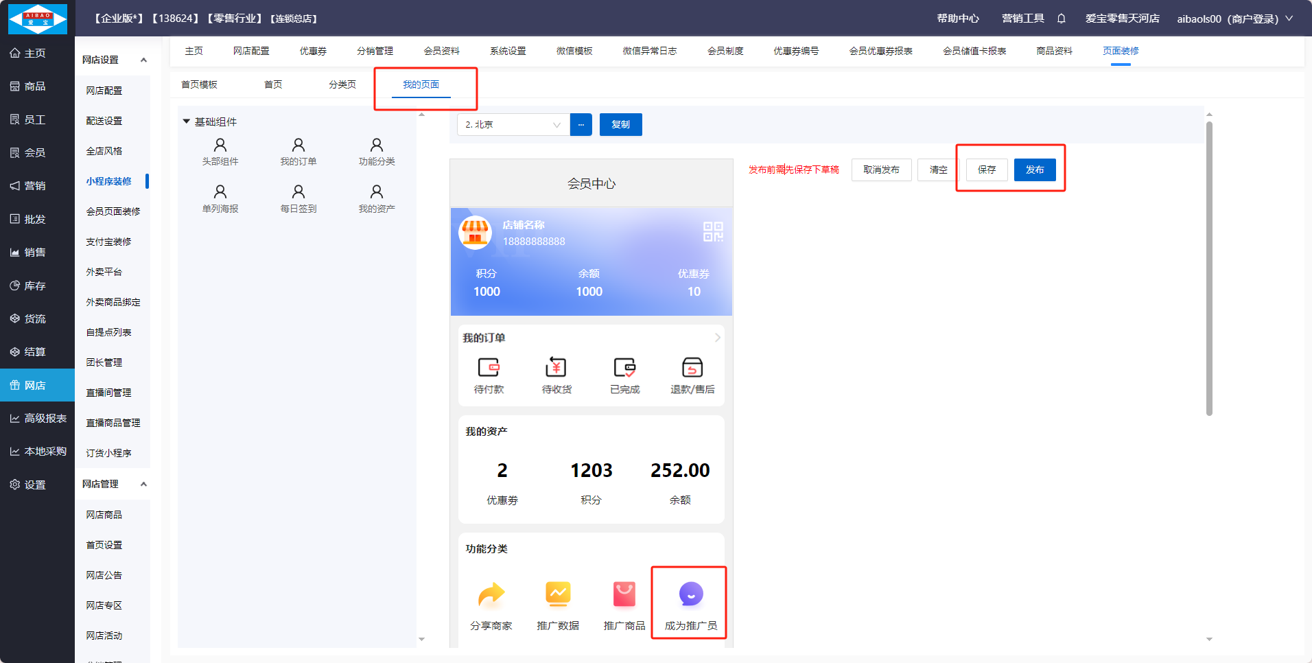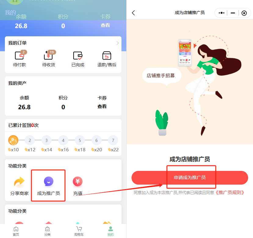 前提:商家需要在小程序装修模块将“成为推广员”入口添加进来,并保存发布小程序