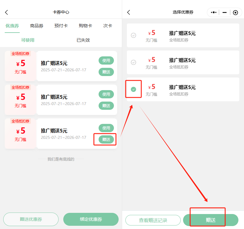优惠券单张赠送,选择需要赠送的优惠券,点击“赠送”按钮