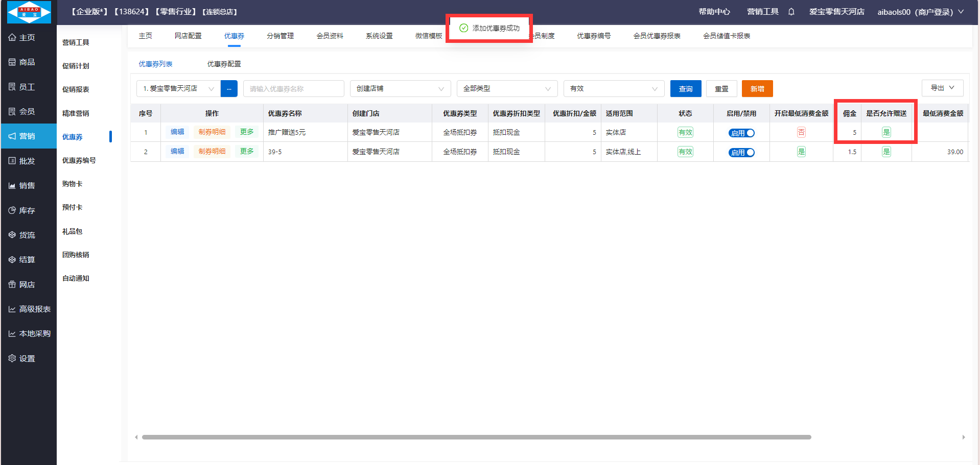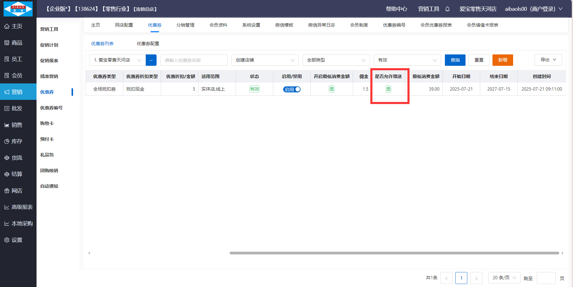 在【营销】-【优惠券】查看允许赠送的优惠券