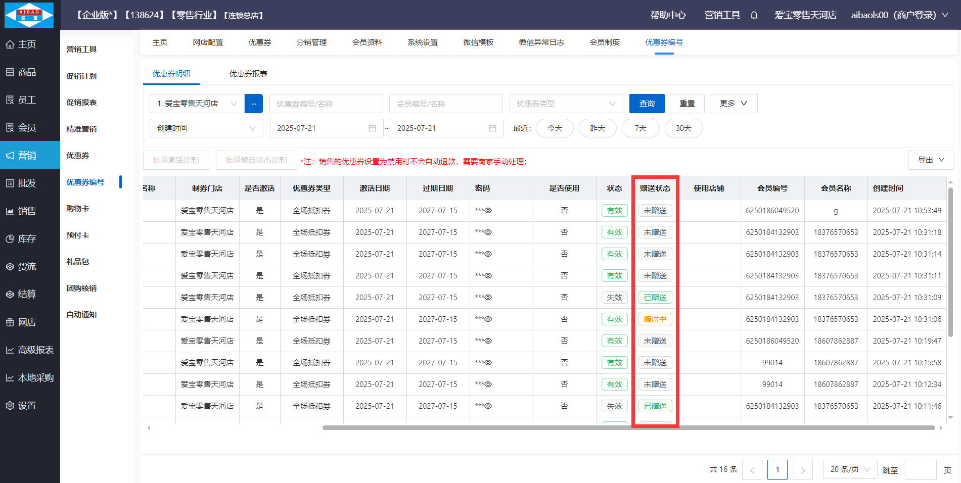 在【营销】-【优惠券编号】可查看优惠券赠送状态