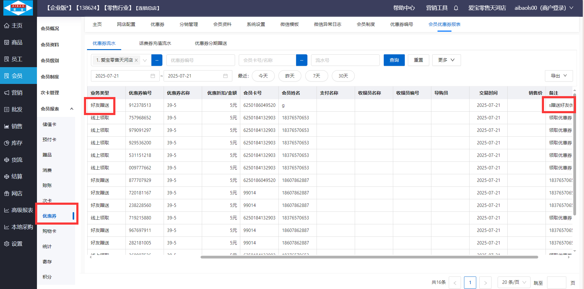 在【会员】-【会员报表】-【优惠券】查看“好友赠送”领取优惠券信息,并备注提示是哪位会员赠送好友优惠券