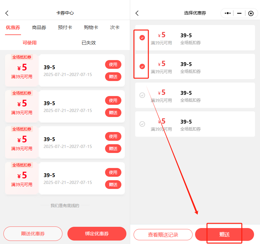 勾选需要赠送的优惠券信息,点击“赠送”按钮