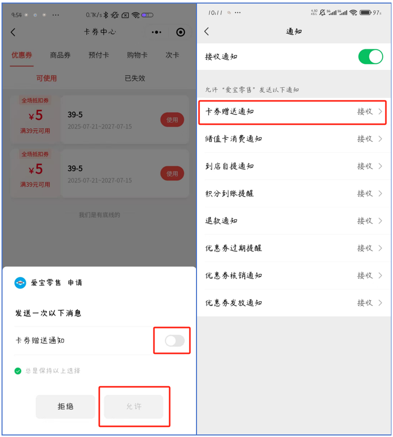 会员在小程序操作赠送功能时,需要授权卡券赠送通知功能